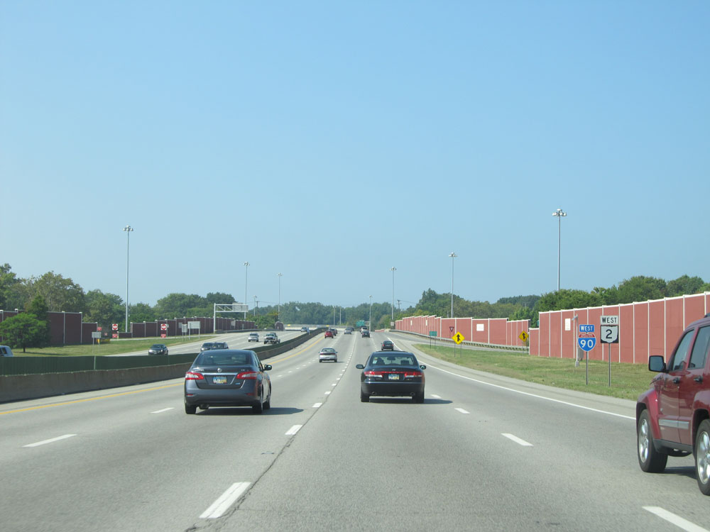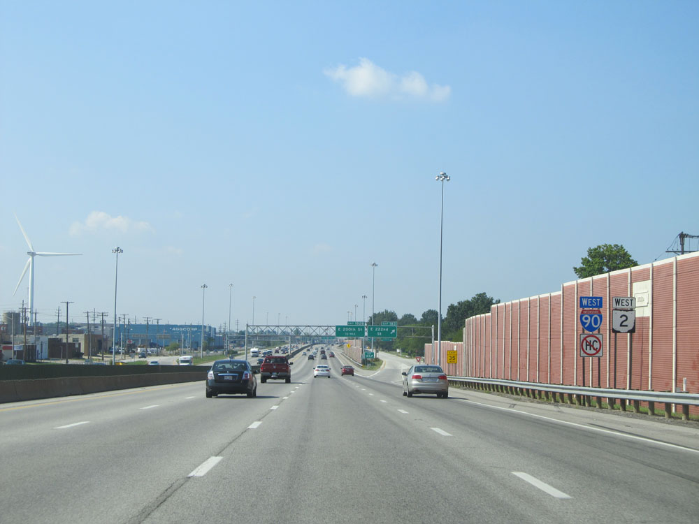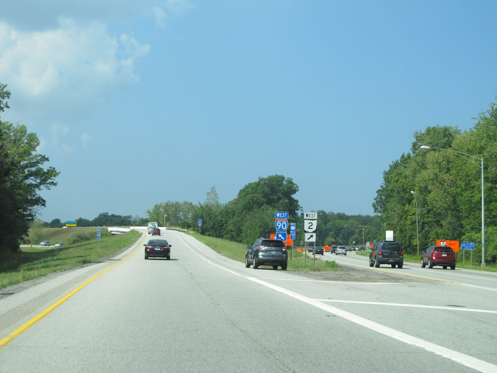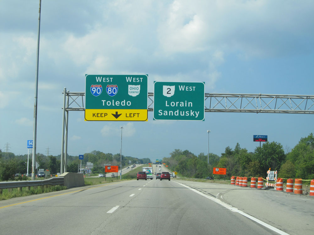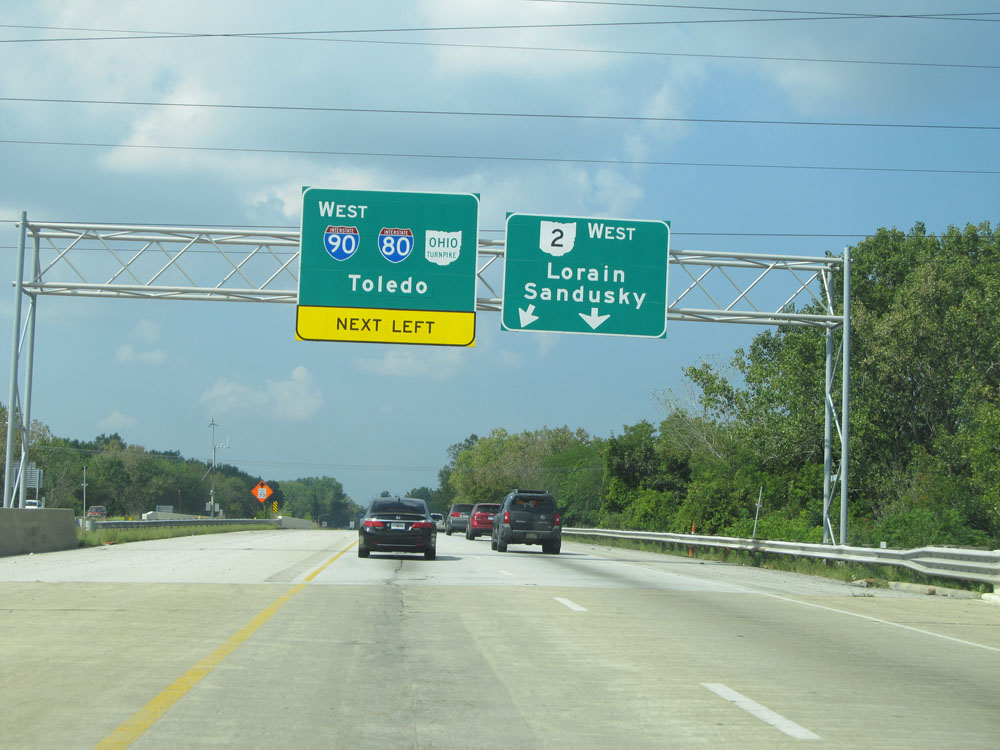 Interstate 90 West at the split of OH 2. Keep to the left here to remain on I-90 West, where it will join up with Interstate 80 West and the Ohio Turnpike. (Photo taken 9/6/15).