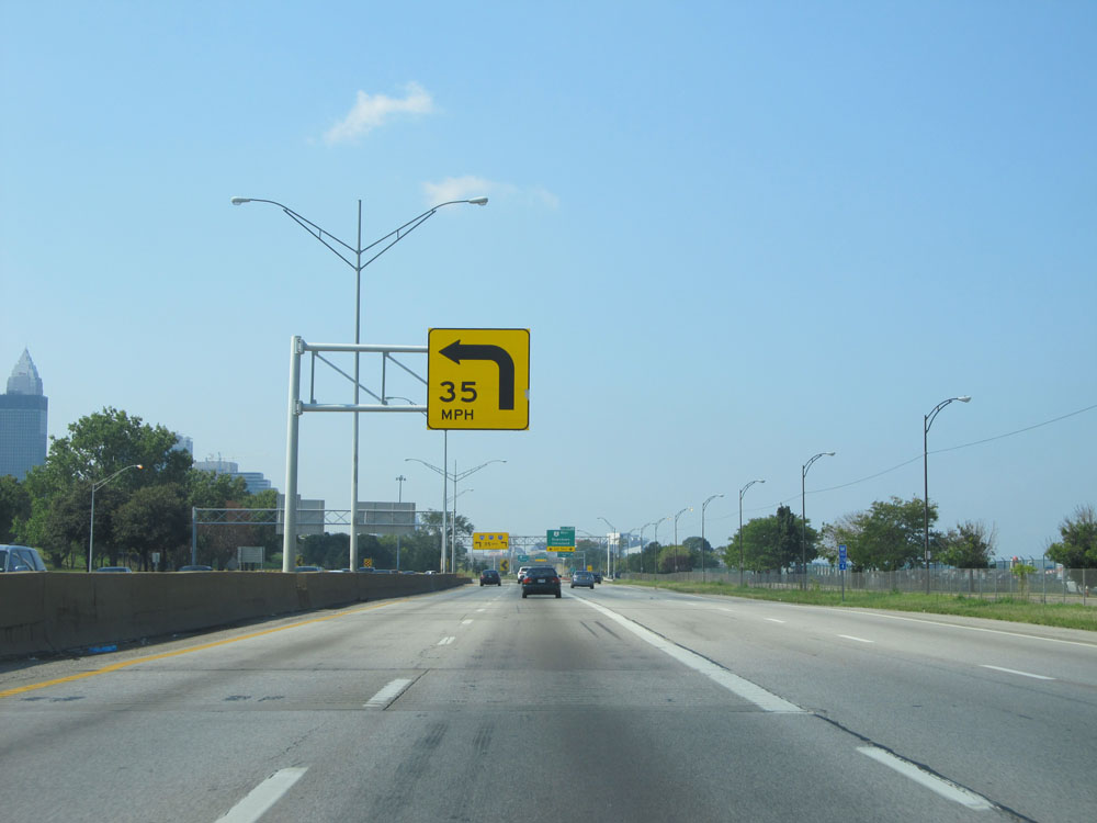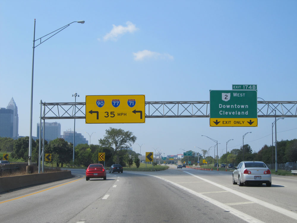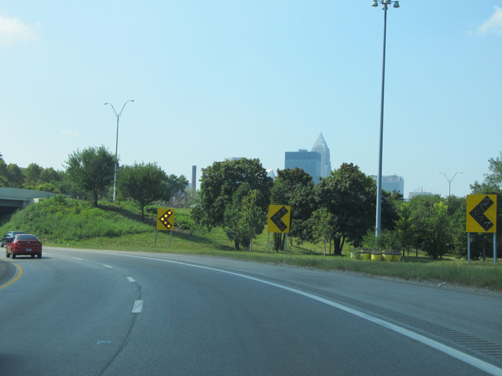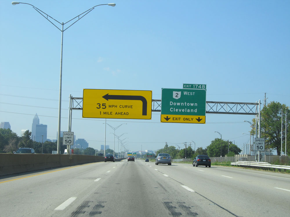 Interstate 90 West at Exit 174B: OH 2 West - Downtown Cleveland. Ahead, you can see just how sharp Dead Man's Curve really is just before we reach it. (Photo taken 9/6/15).