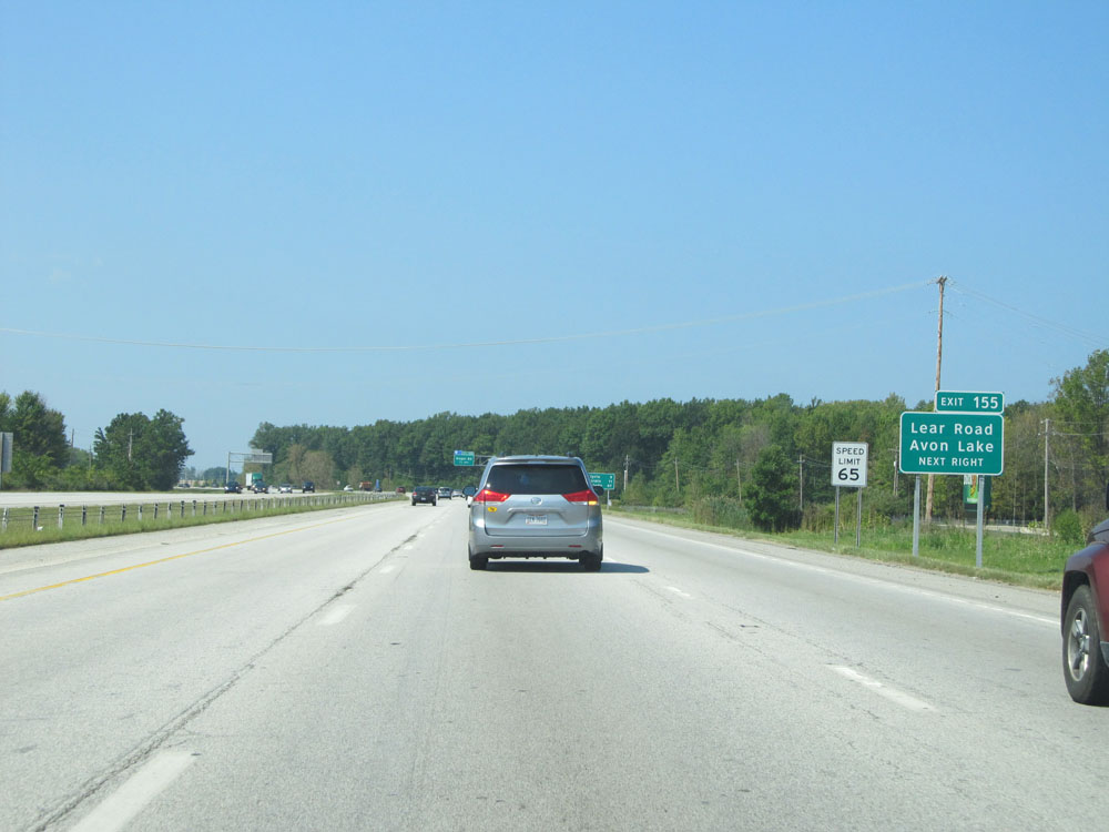 Upon entering Lorain County, the speed limit increases to 65 mph. Also, take Exit 155 to Lear Road and Avon Lake. (Photo taken 9/6/15).