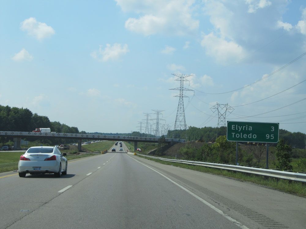 Mileage sign beyond Exit 151. It's 3 miles to Elyria and 95 miles to Toledo. (Photo taken 9/6/15).