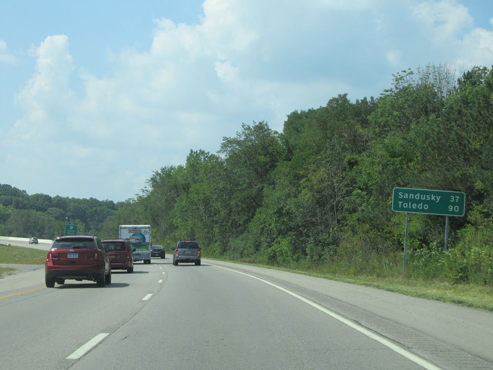 Mileage sign on Interstate 90 West. It's 37 miles to Sandusky and 90 miles to Toledo. (Photo taken 9/6/15).