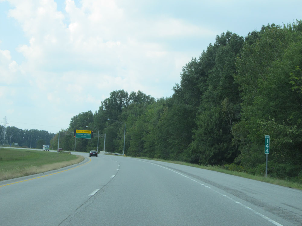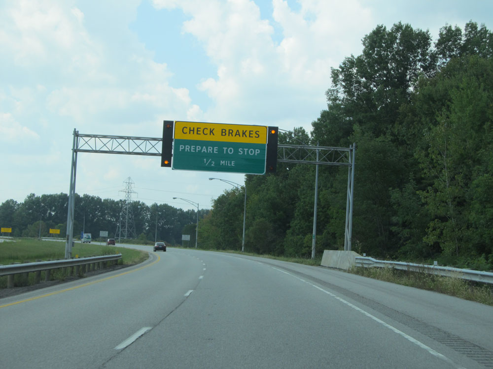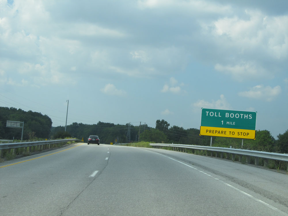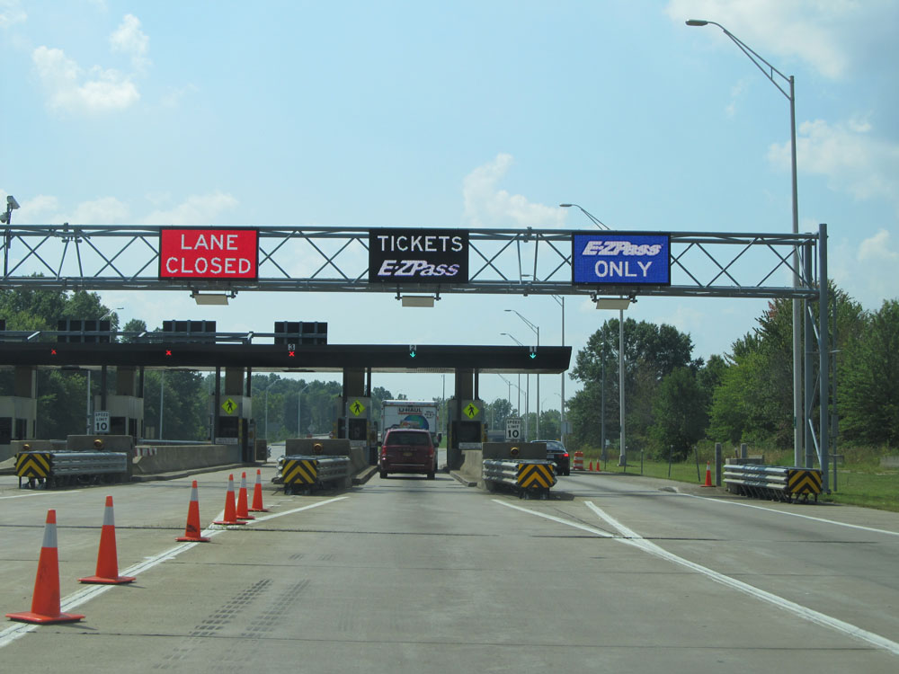 The toll plaza for the Ohio Turnpike lies 1 mile ahead. (Photo taken 9/6/15).