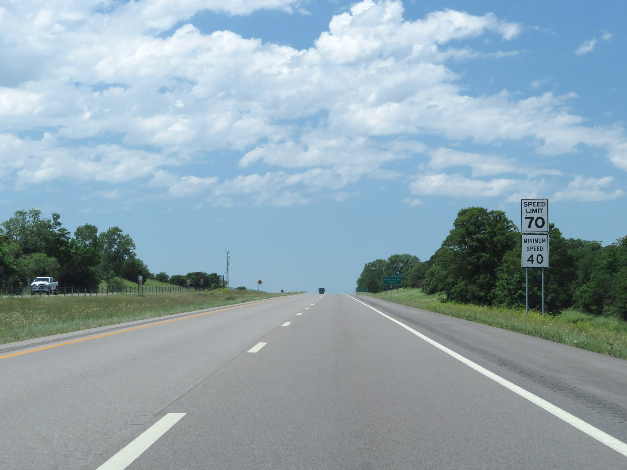 The speed limits on Interstate 240 West start out at 70 mph maximum and 40 mph minimum. These are the standard speed limits on most rural non-tolled Interstate highways in Oklahoma. (Photo taken 5/18/18). |