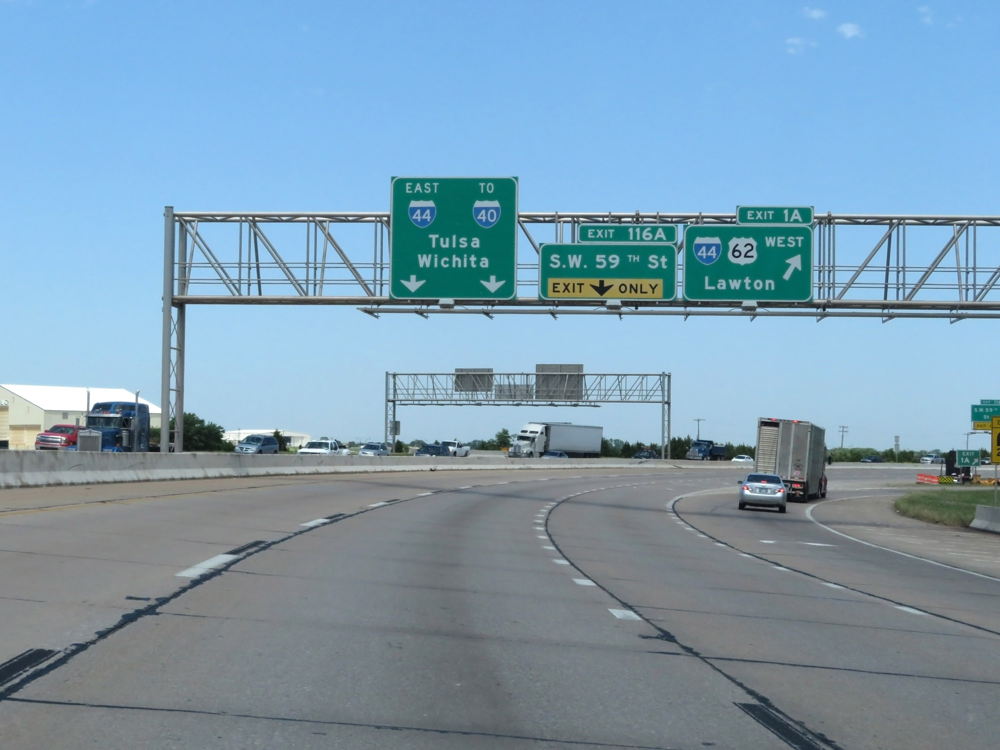 Interstate 240 West at Exit 1A: Interstate 44 West / US 62 West - Lawton (Photo taken 5/18/18). |