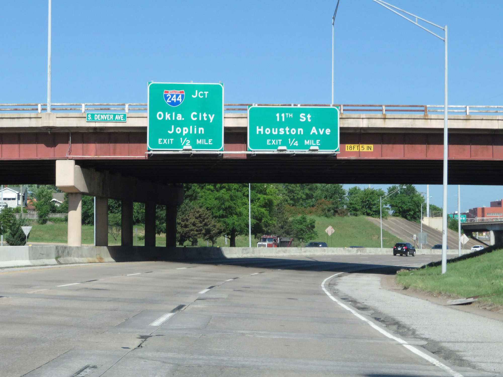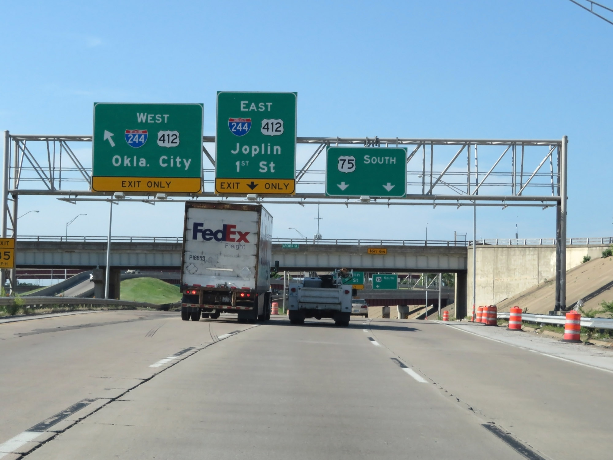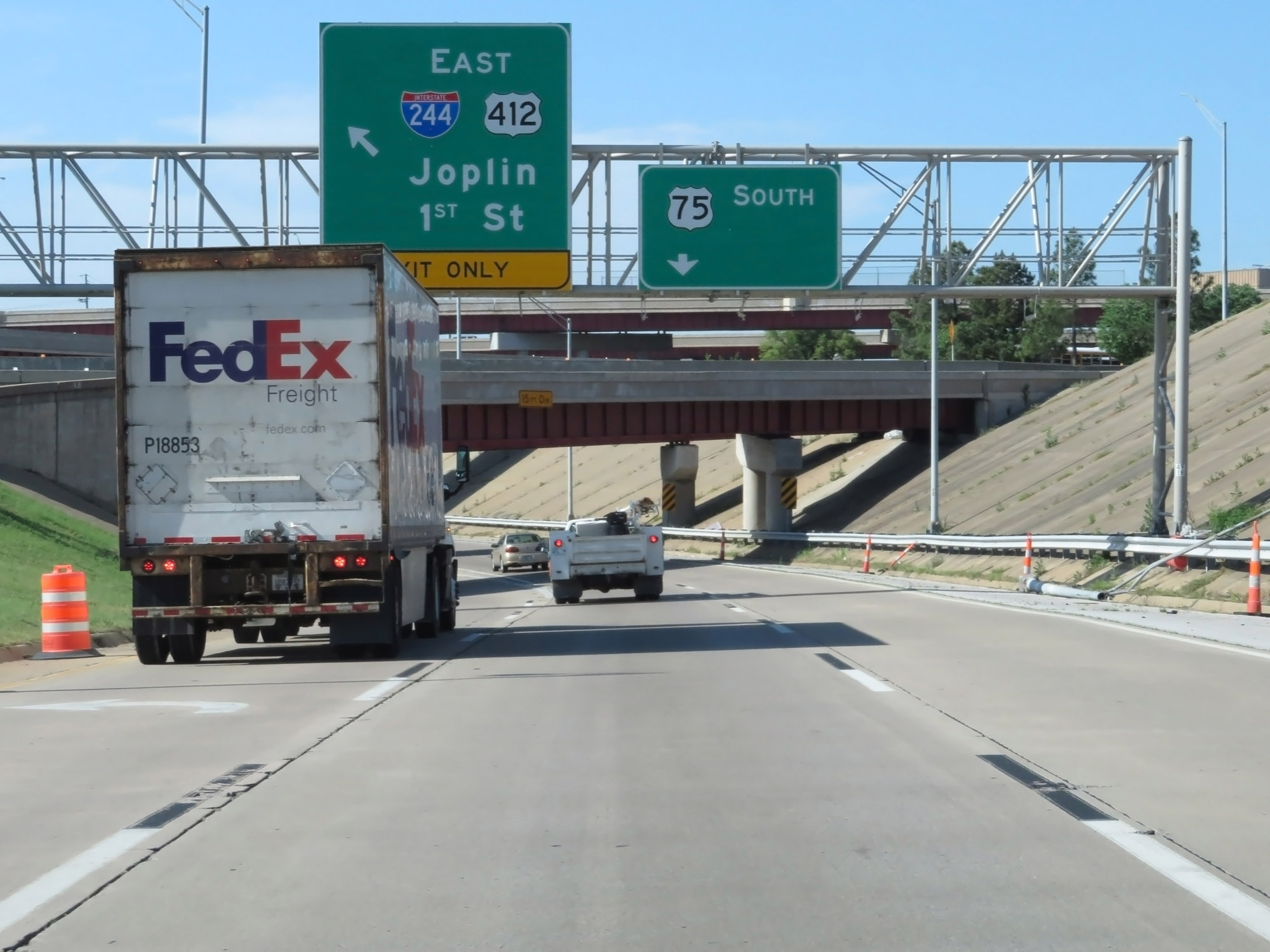 Unsigned Interstate 444 South / US 75 South at Exit: Interstate 244 East / US 412 East - Joplin / 1st St (Photo taken 5/18/18). |
