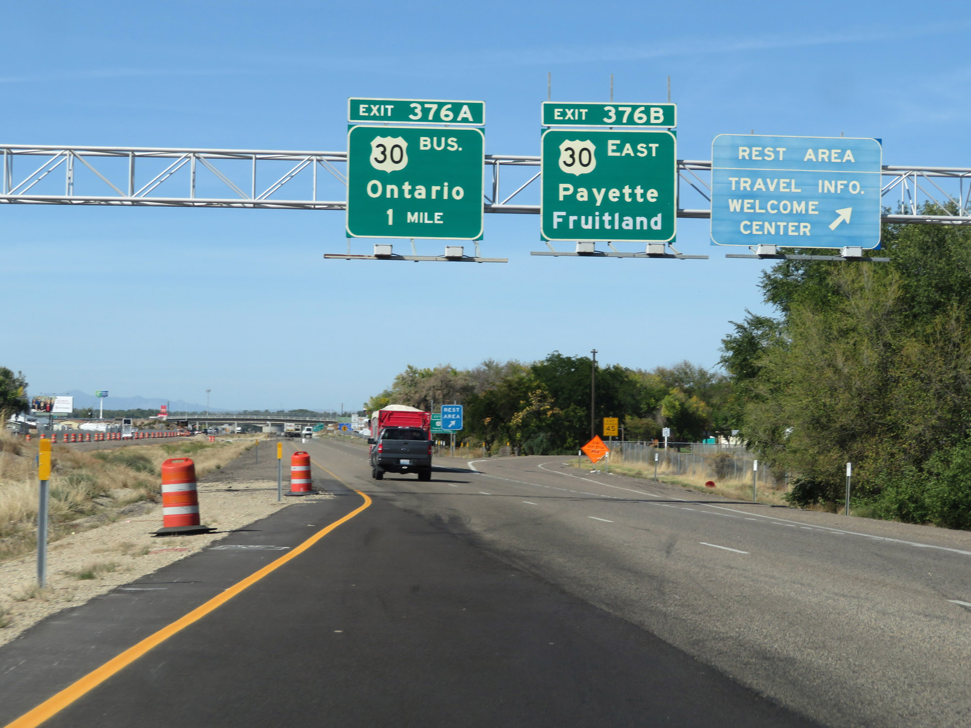 Interstate 84 West at Exit 224: Poverty Flat Rd / Old Emigrant Hill Rd (Photo taken 9/25/19). |
