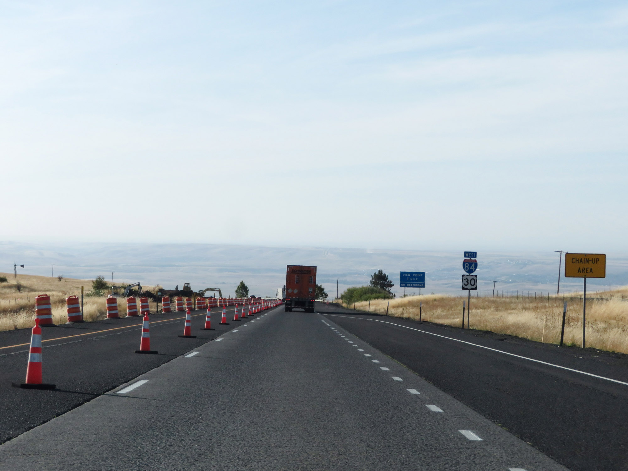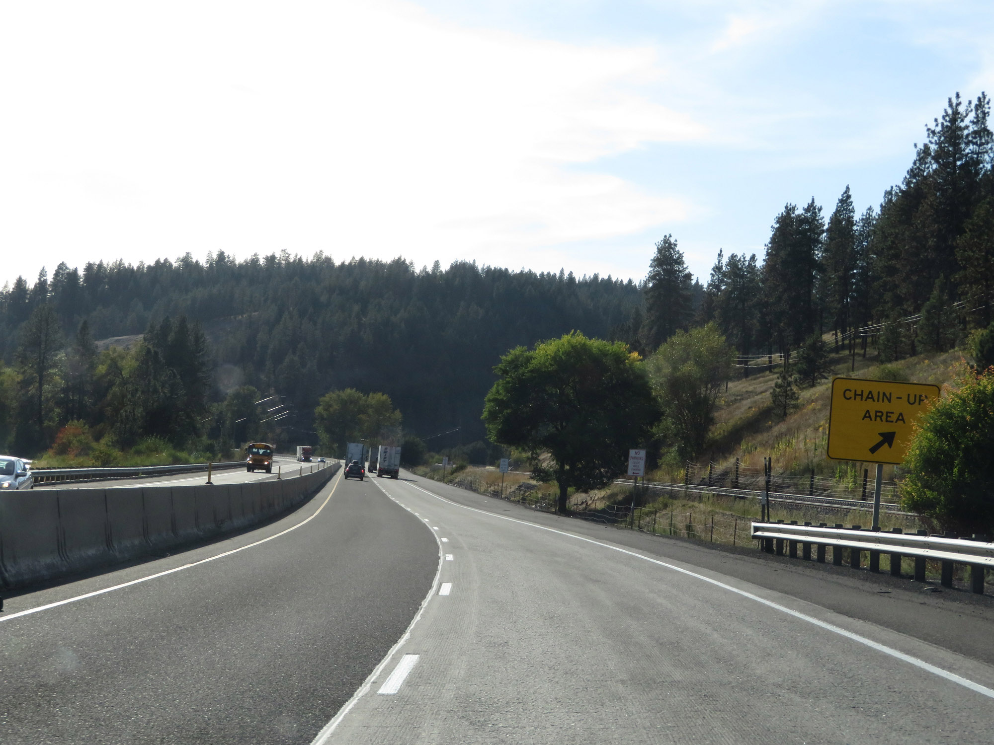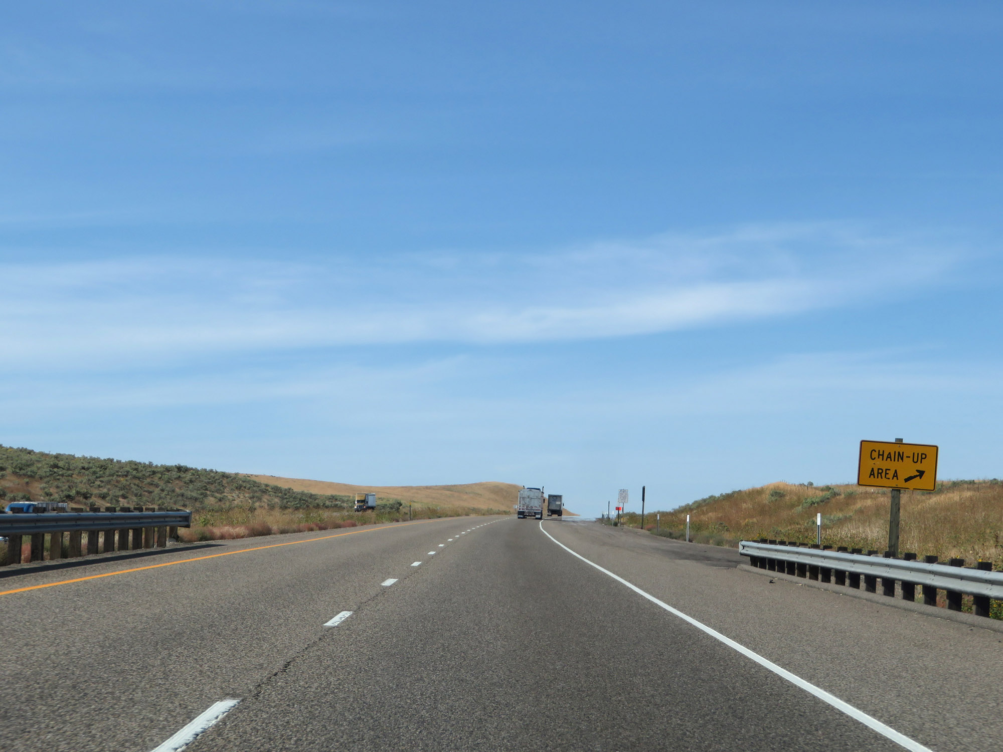 Approaching the next stretch of windy road, a Chain-Up Area exists to the west of La Grande. (Photo taken 9/25/19). |