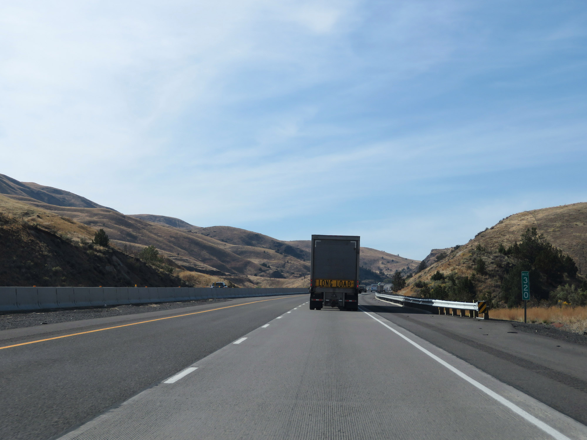 Looking to the south as we descend Deadman Pass, we get this view of the eastbound lanes of Interstate 84 making the steep climb up Cabbage Hill. (Photo taken 9/25/19). |