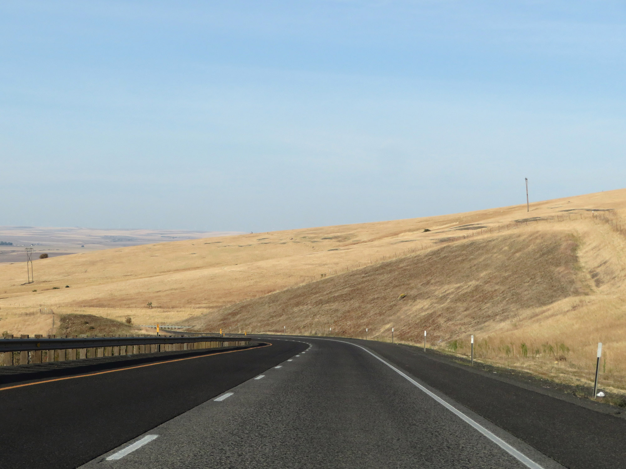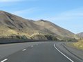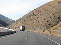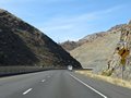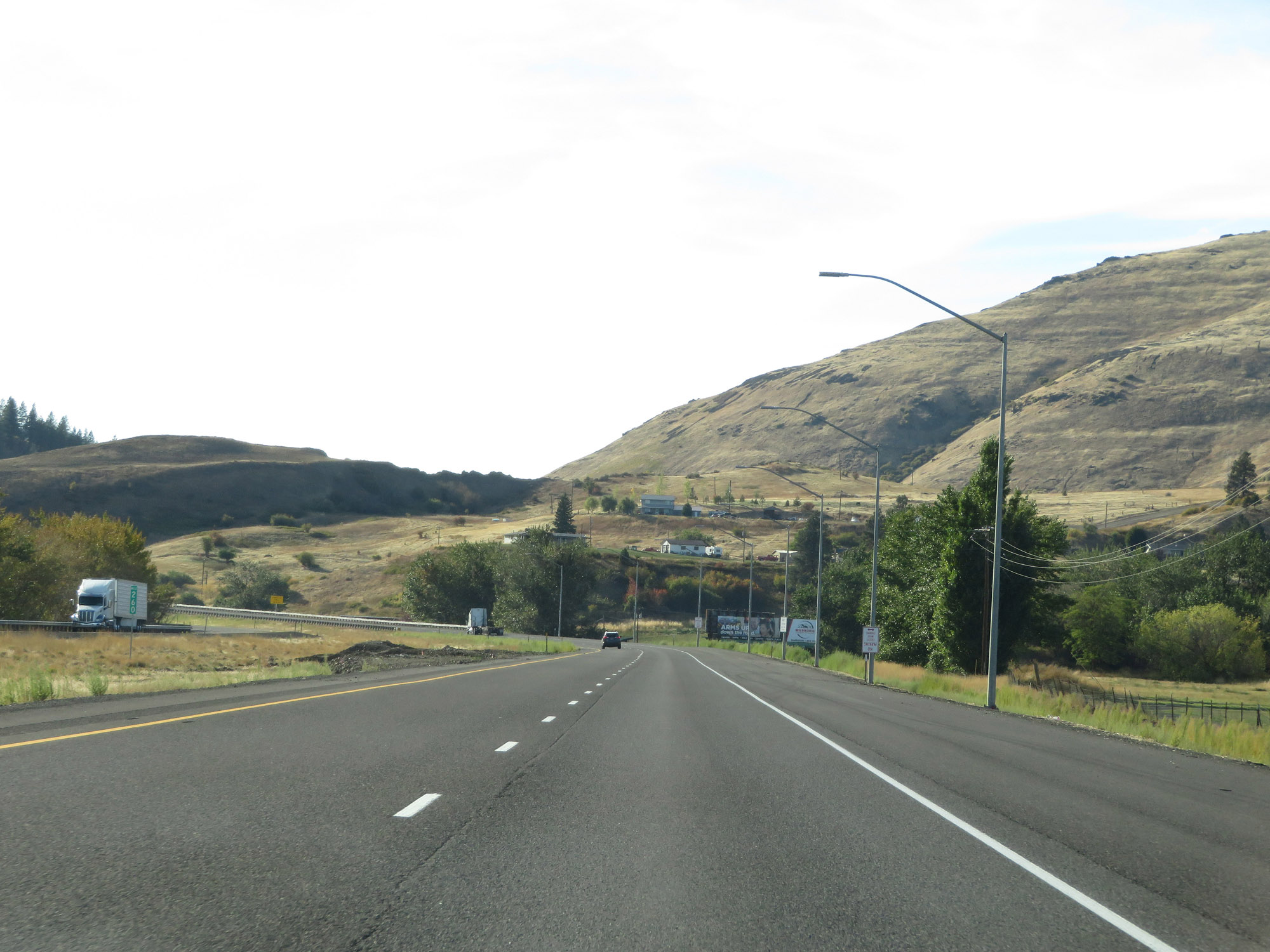 View on Interstate 84 West as the curves continue. During this stretch, I-84 closely follows the Grande Ronde River through a winding valley, with several canyons surrounding the area. (Photo taken 9/25/19). |