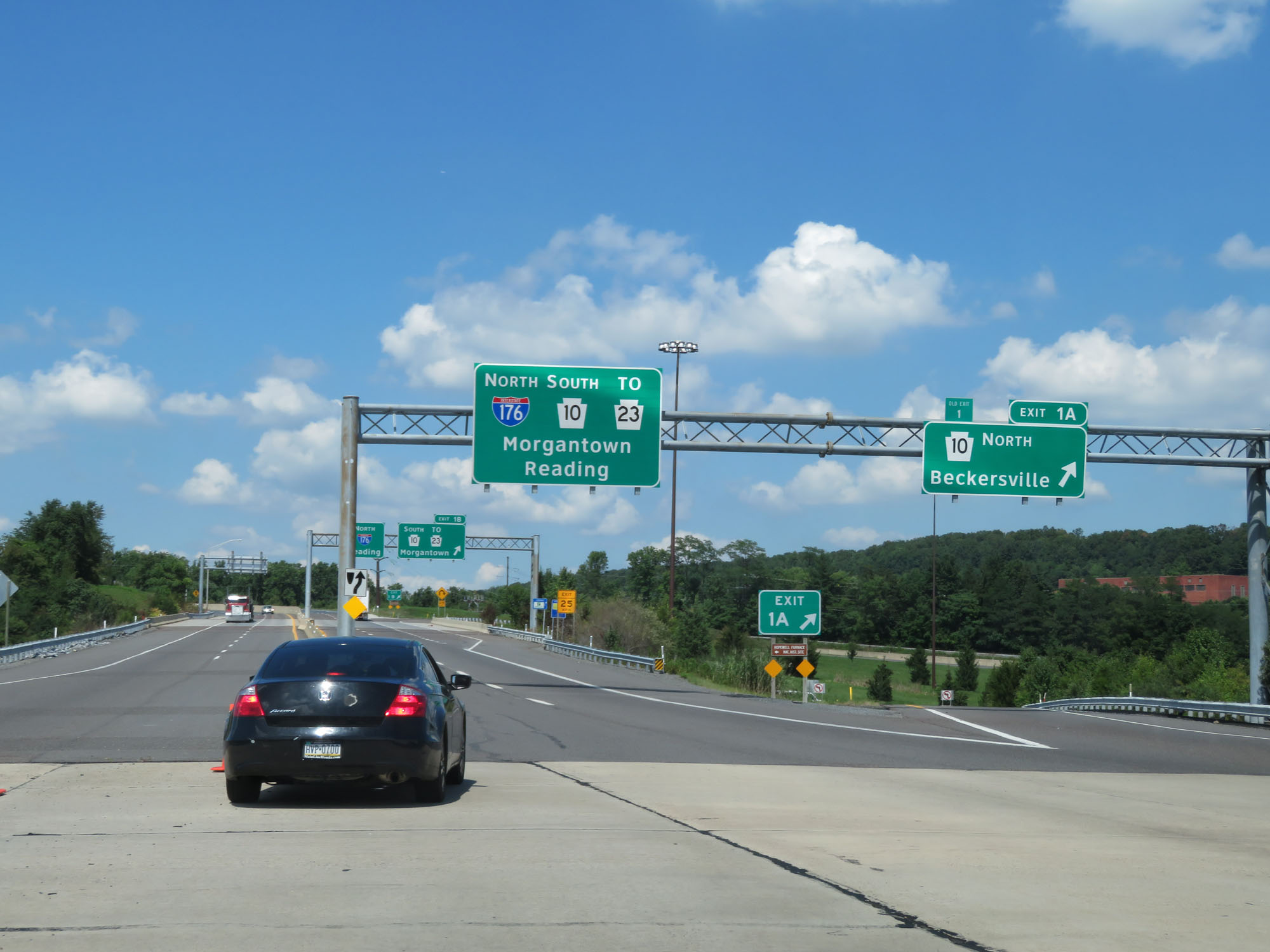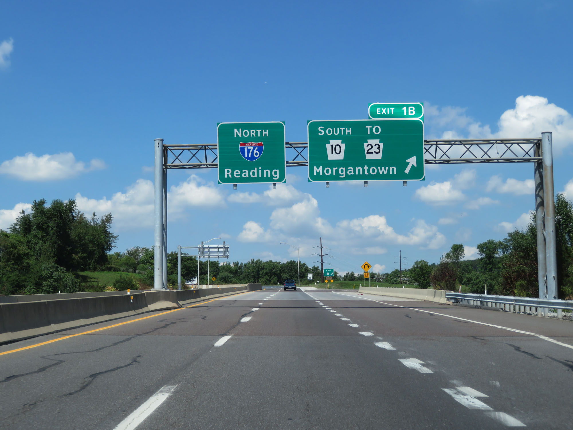Interstate 176 North at Exit 1B: PA 10 South / To PA 23 - Morgantown (Photo taken 8/19/16). |