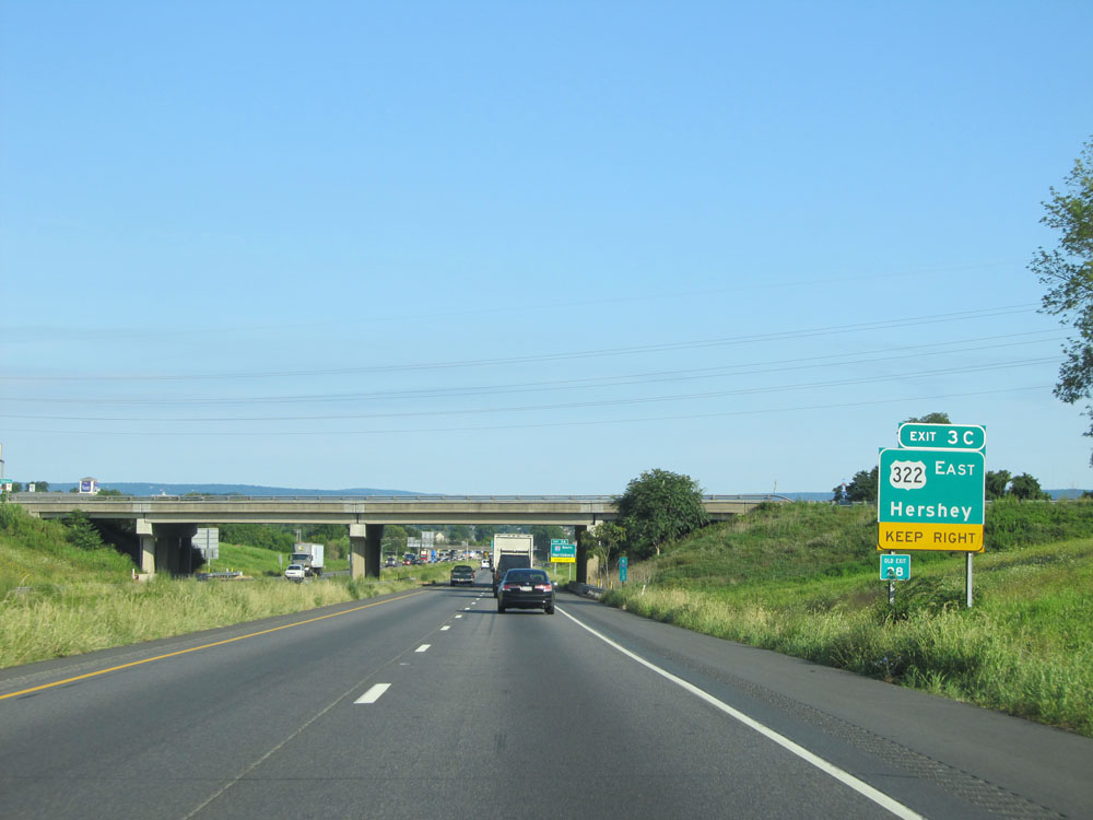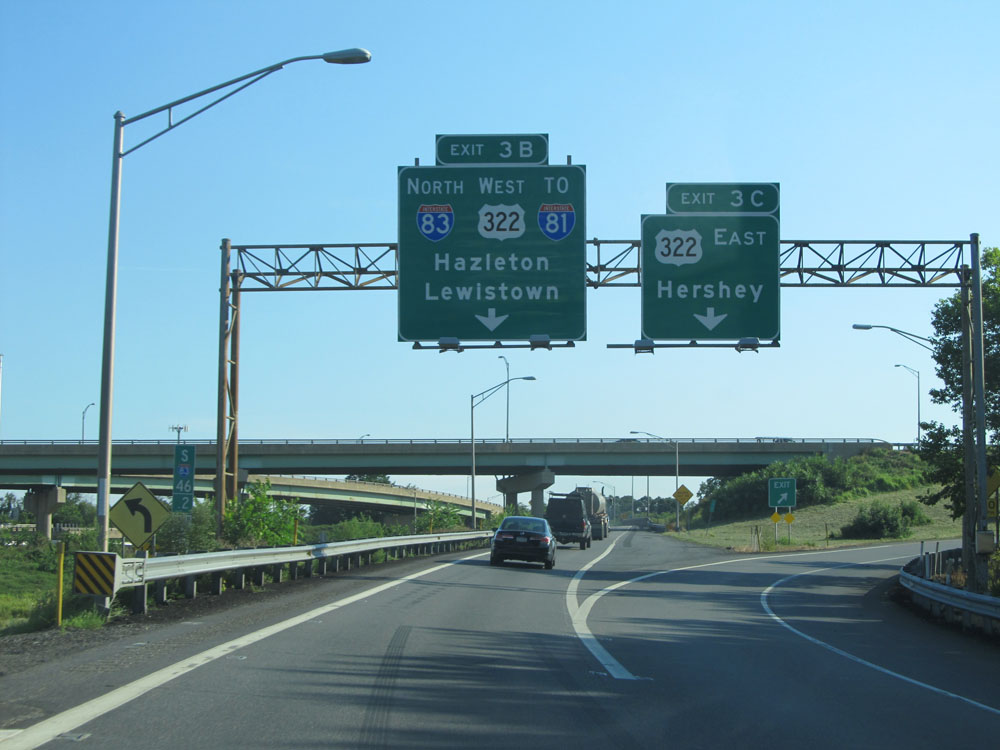 Interstate 283 North at Exit 3B: Interstate 83 North / US 322 West / To Interstate 81 - Hazleton / Lewistown; Exit 3C: US 322 East - Hershey (Photo taken 8/7/15).