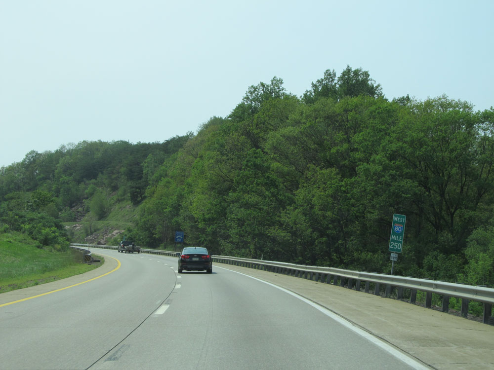 At mile marker 251.1, Interstate 80 West briefly curves to the north. (Photo taken 7/5/15).