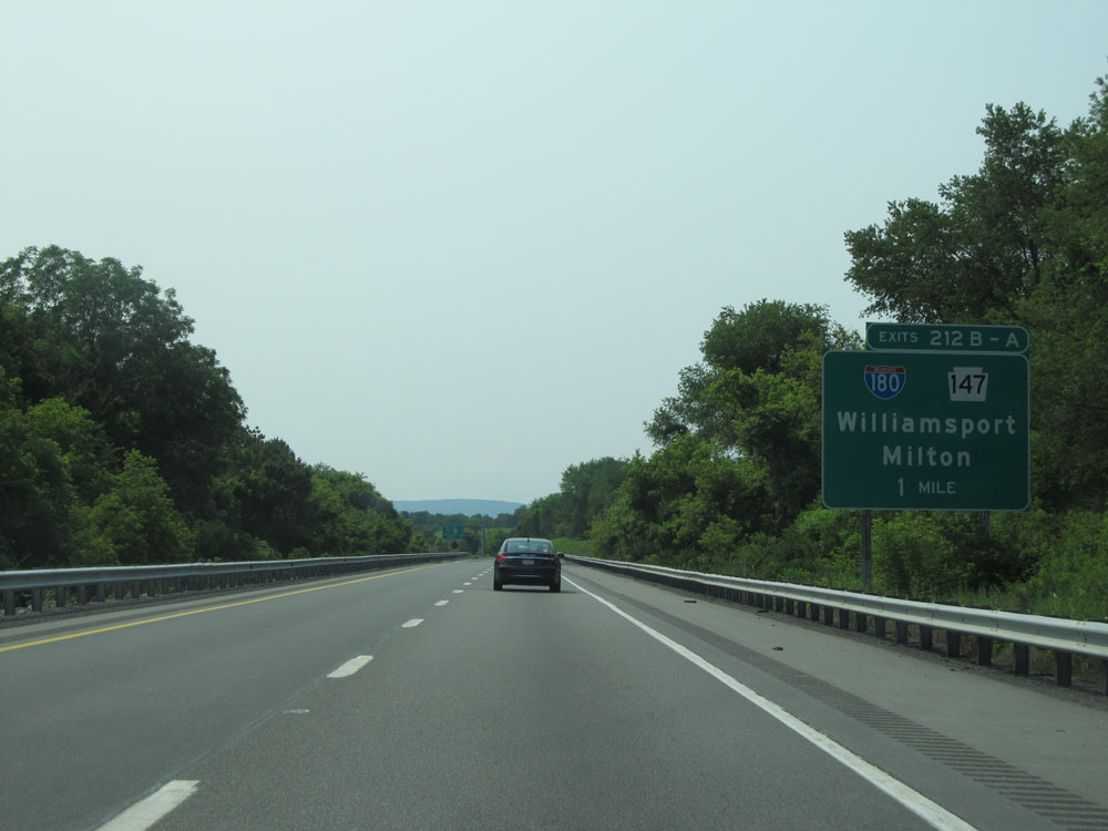 Interstate 80 West at the ramp for Exits 212B-A: Interstate 180 West / PA 147 South - Williamsport / Milton (Photo taken 7/5/15).