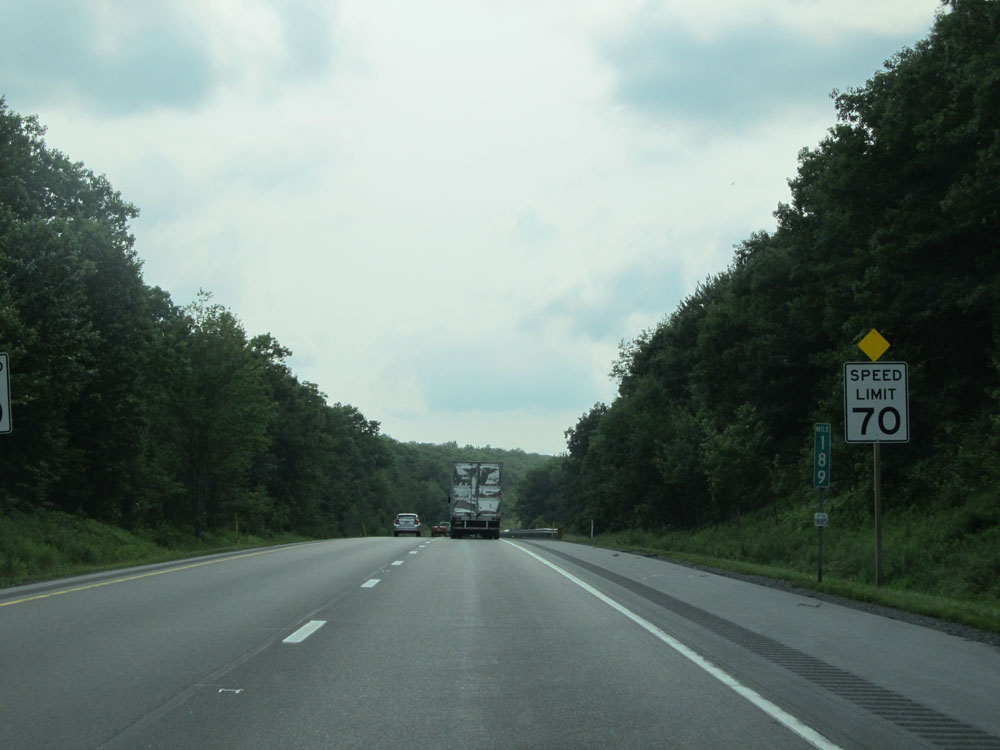 At mile marker 189, as Interstate 80 West enters Clinton County, the speed limit increases to 70 mph. . (Photo taken 7/5/15).