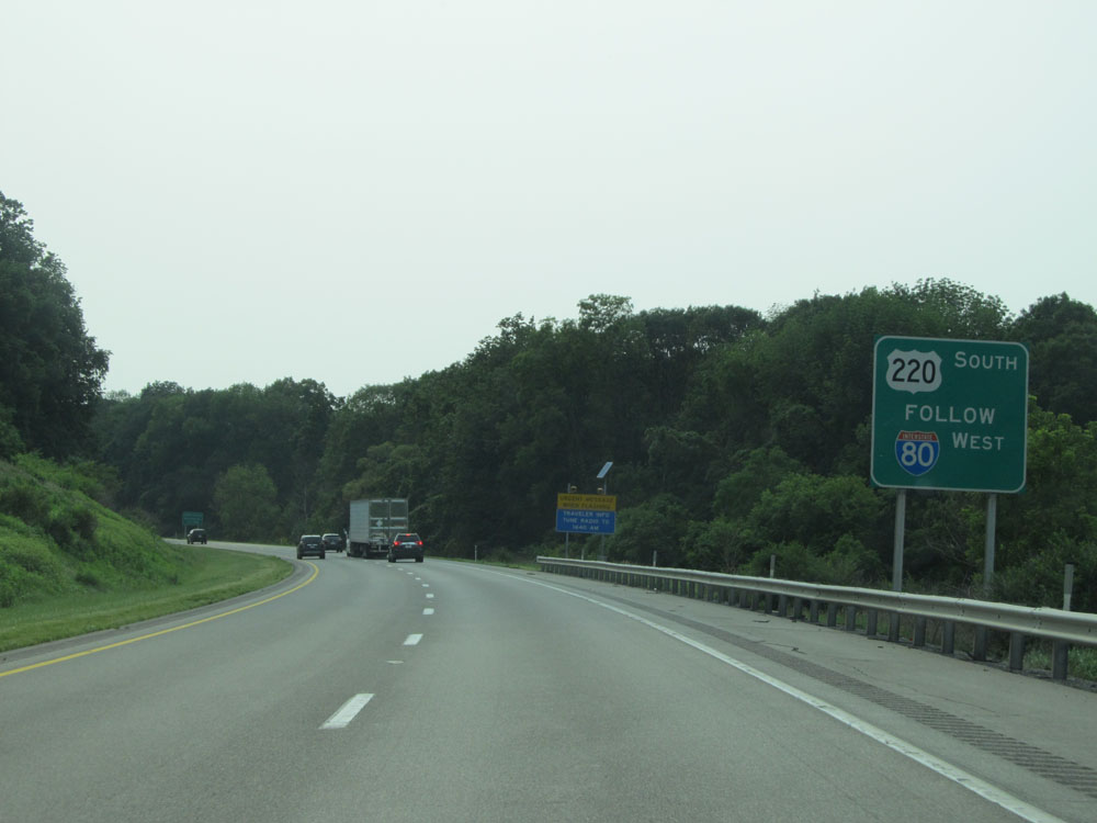 The next exit is for US 220 North. Traffic looking to take US 220 South should remain on Interstate 80 West to Exit 161. (Photo taken 7/5/15).