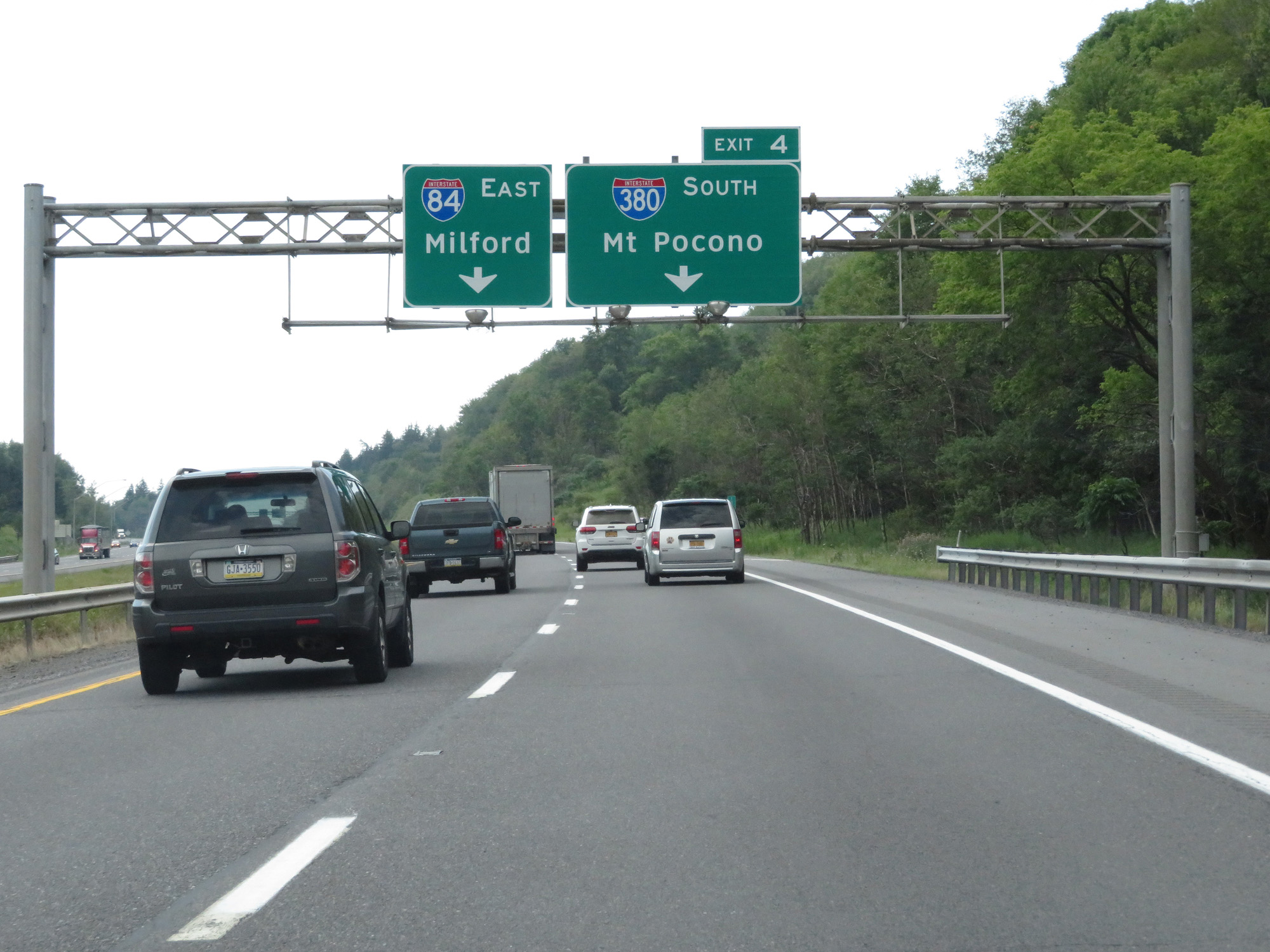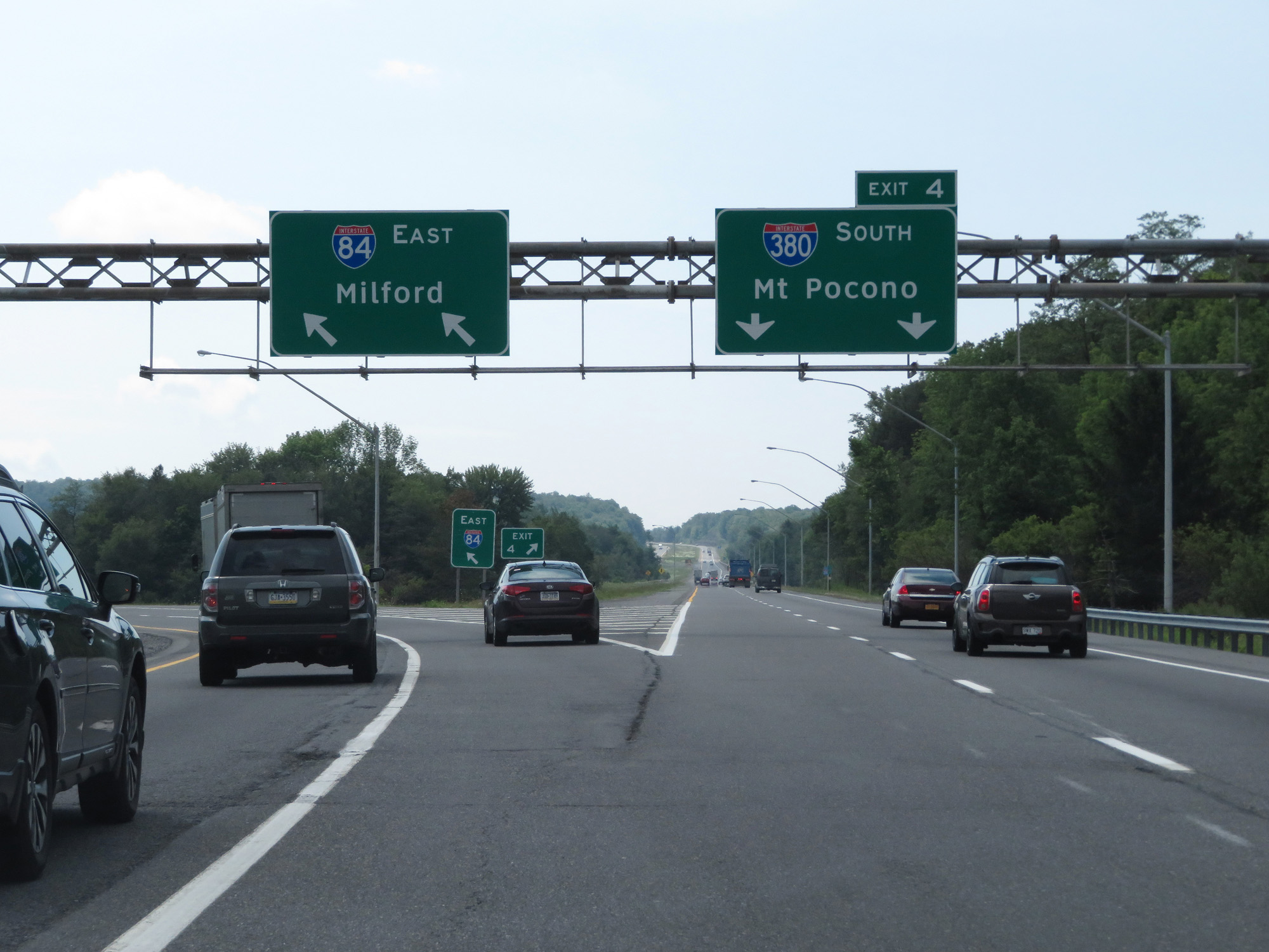 Interstate 84 East / Interstate 380 South at Exit 4: Interstate 380 South - Mt Pocono (Photo taken 8/4/17). |