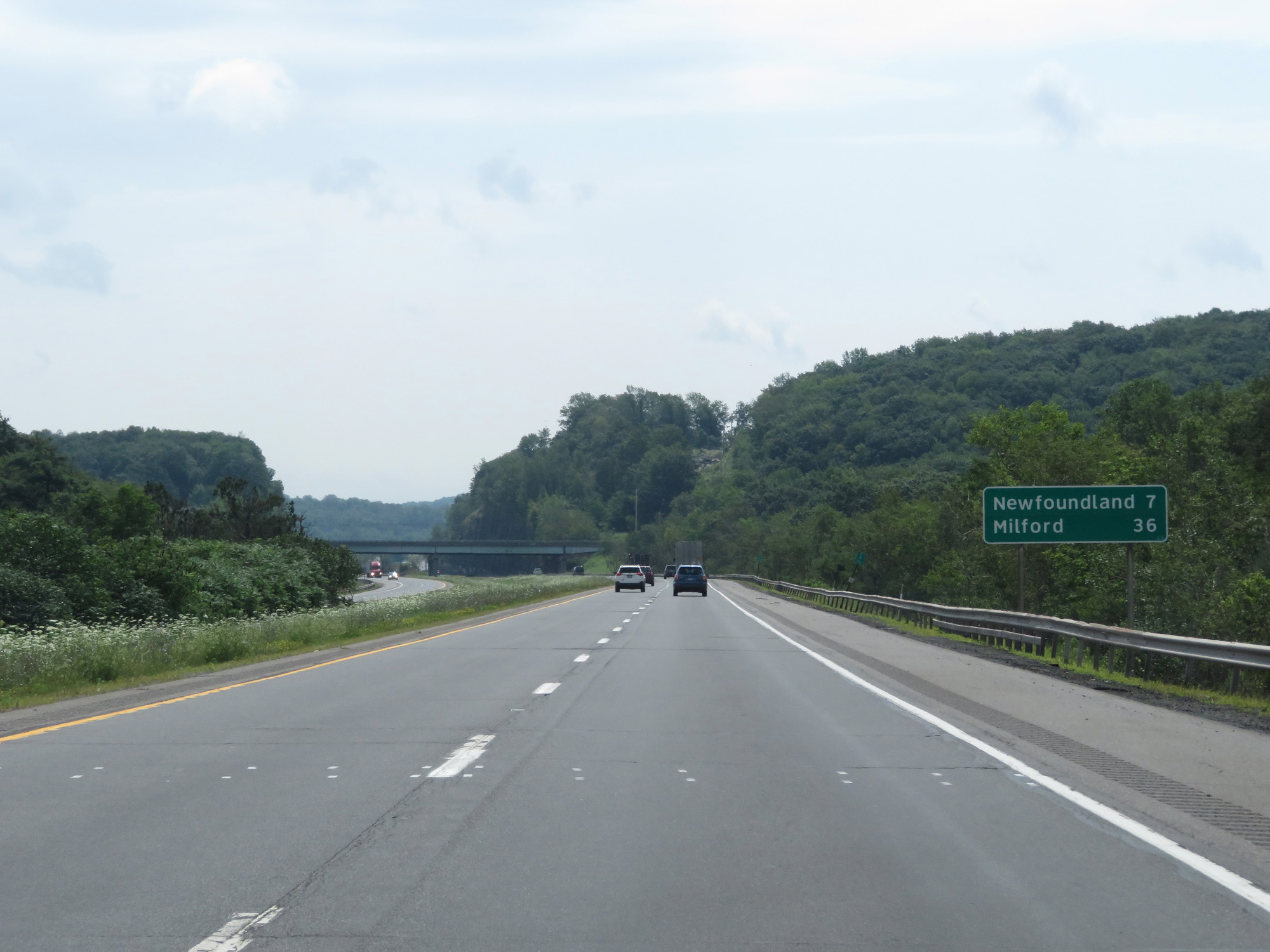 Mileage sign on Interstate 84 East. It's 7 miles to Newfoundland and 36 miles to Milford. (Photo taken 8/4/17). |