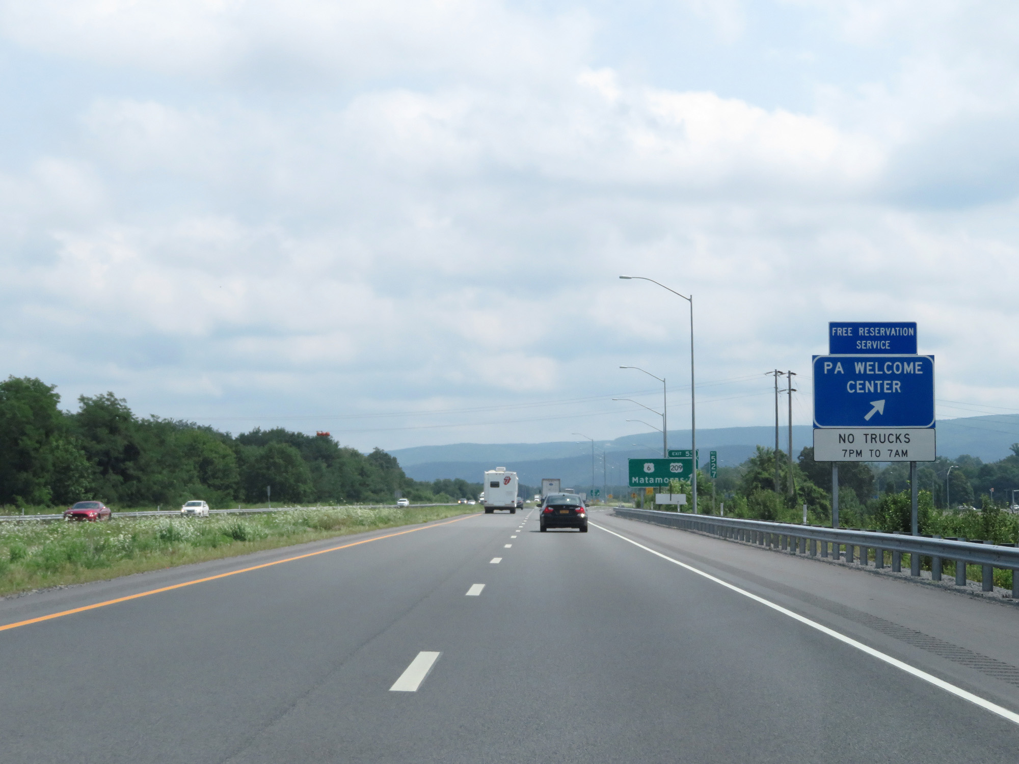 The Pennsylvania Welcome Center is off Exit 53 ahead. No trucks are allowed at the Welcome Center. (Photo taken 8/4/17). |