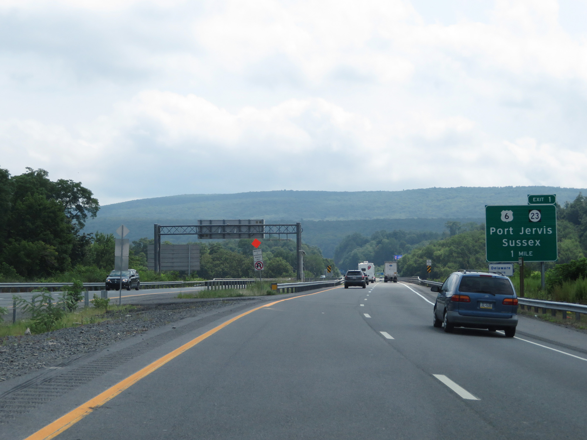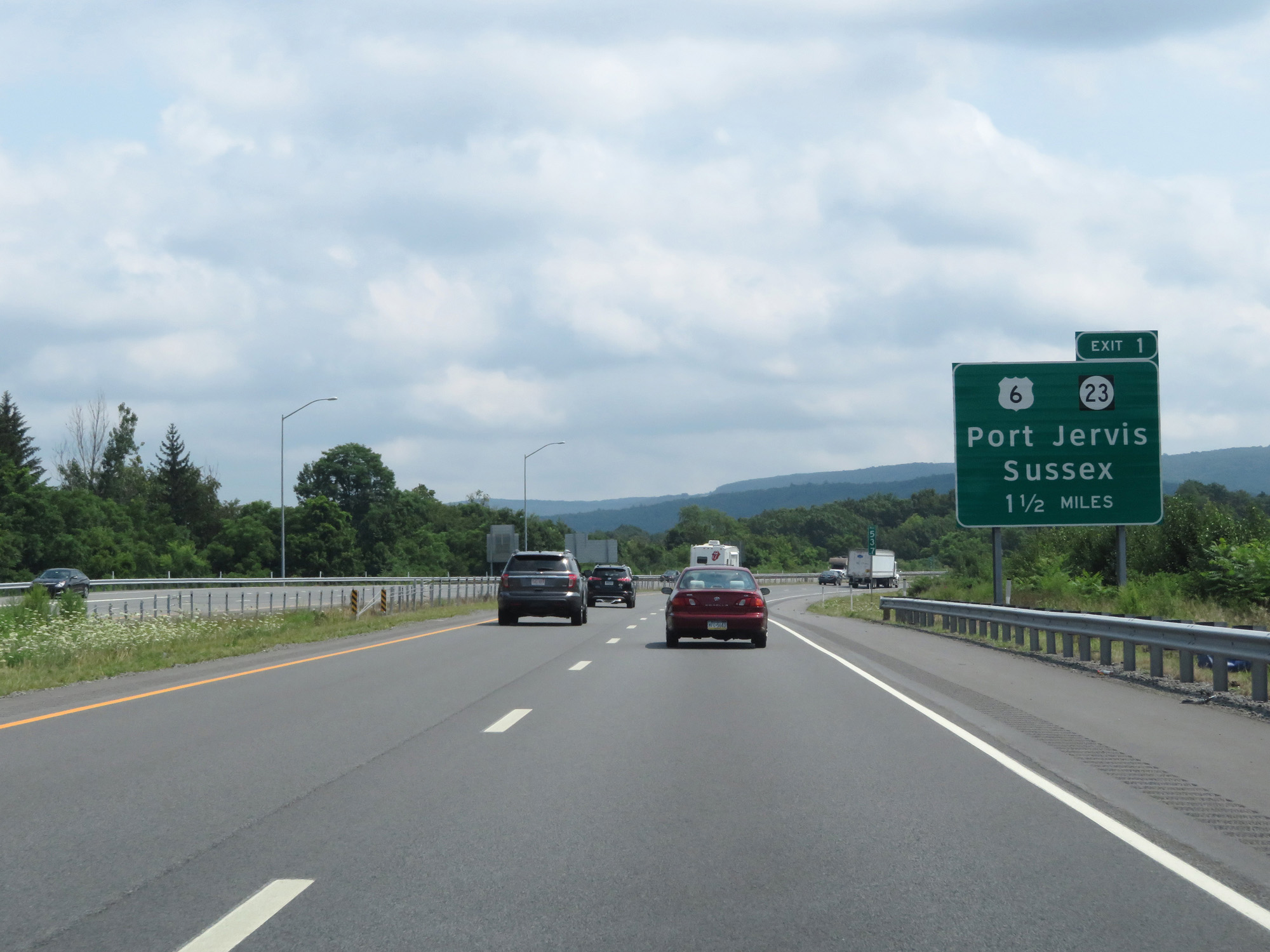 Advance mileage sign for Exit 1 in New York as Interstate 84 East prepares to cross the Delaware River into the Empire State ahead. (Photo taken 8/4/17). |