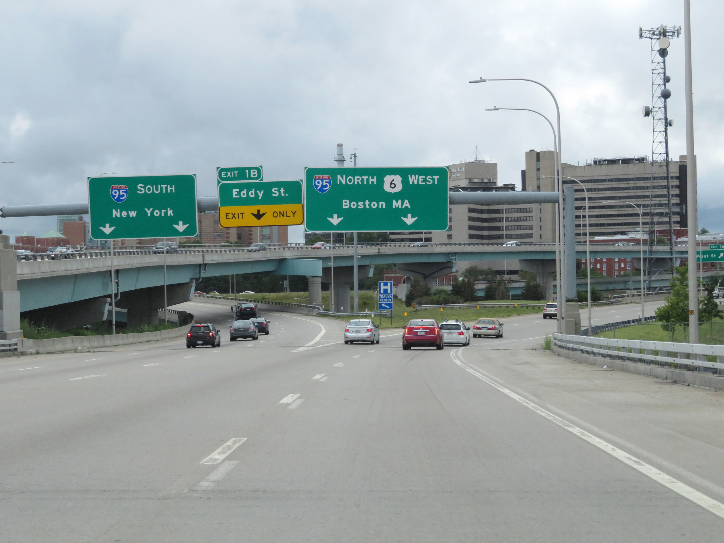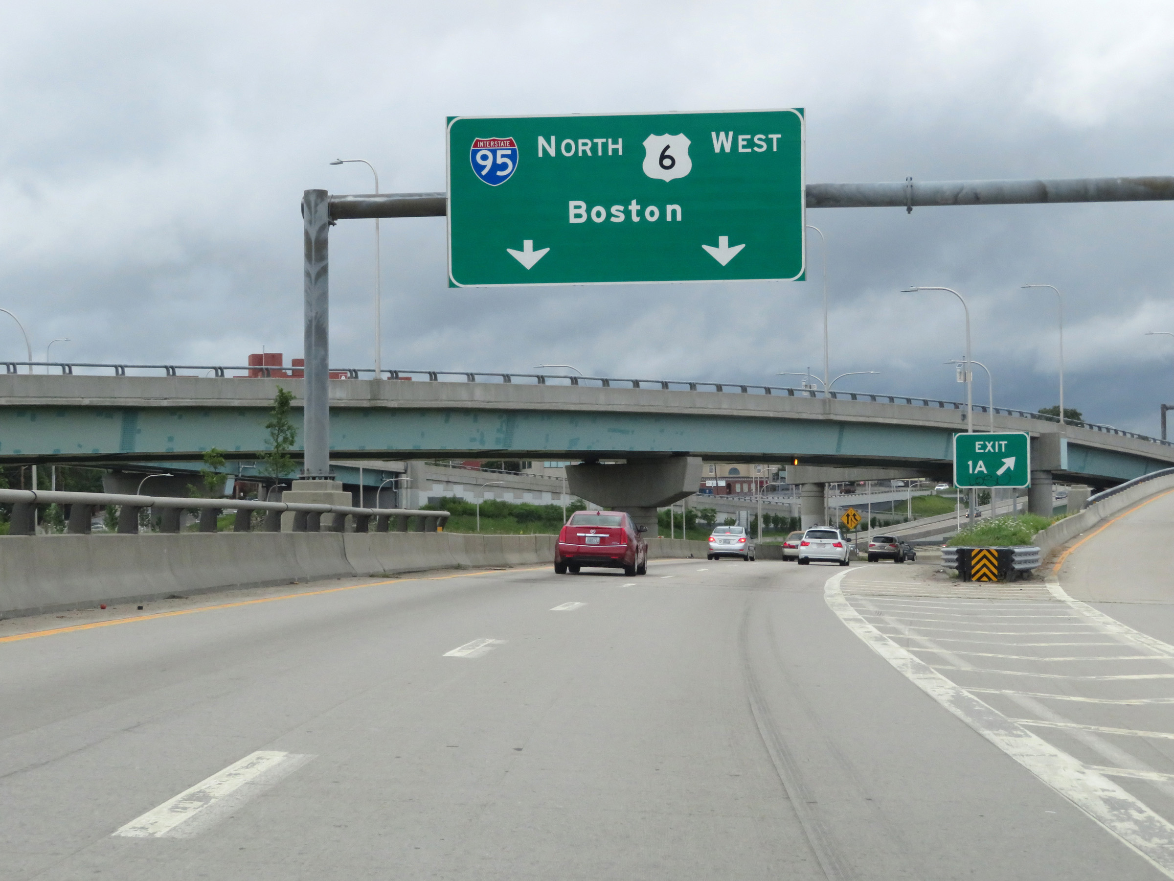 The ramp from Interstate 195 West merges into the northbound lanes of Interstate 95 at mile marker 36.4 in downtown Providence. (Photo taken 8/5/17). |
