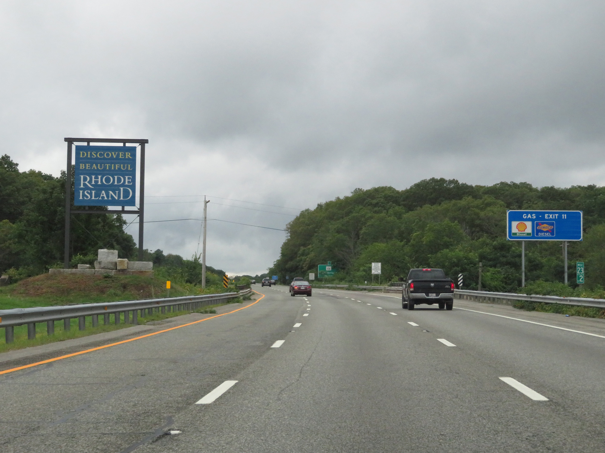 Rhode Island welcome sign as Interstate 295 South enters the Ocean State from Massachusetts. (Photo taken 8/5/17).