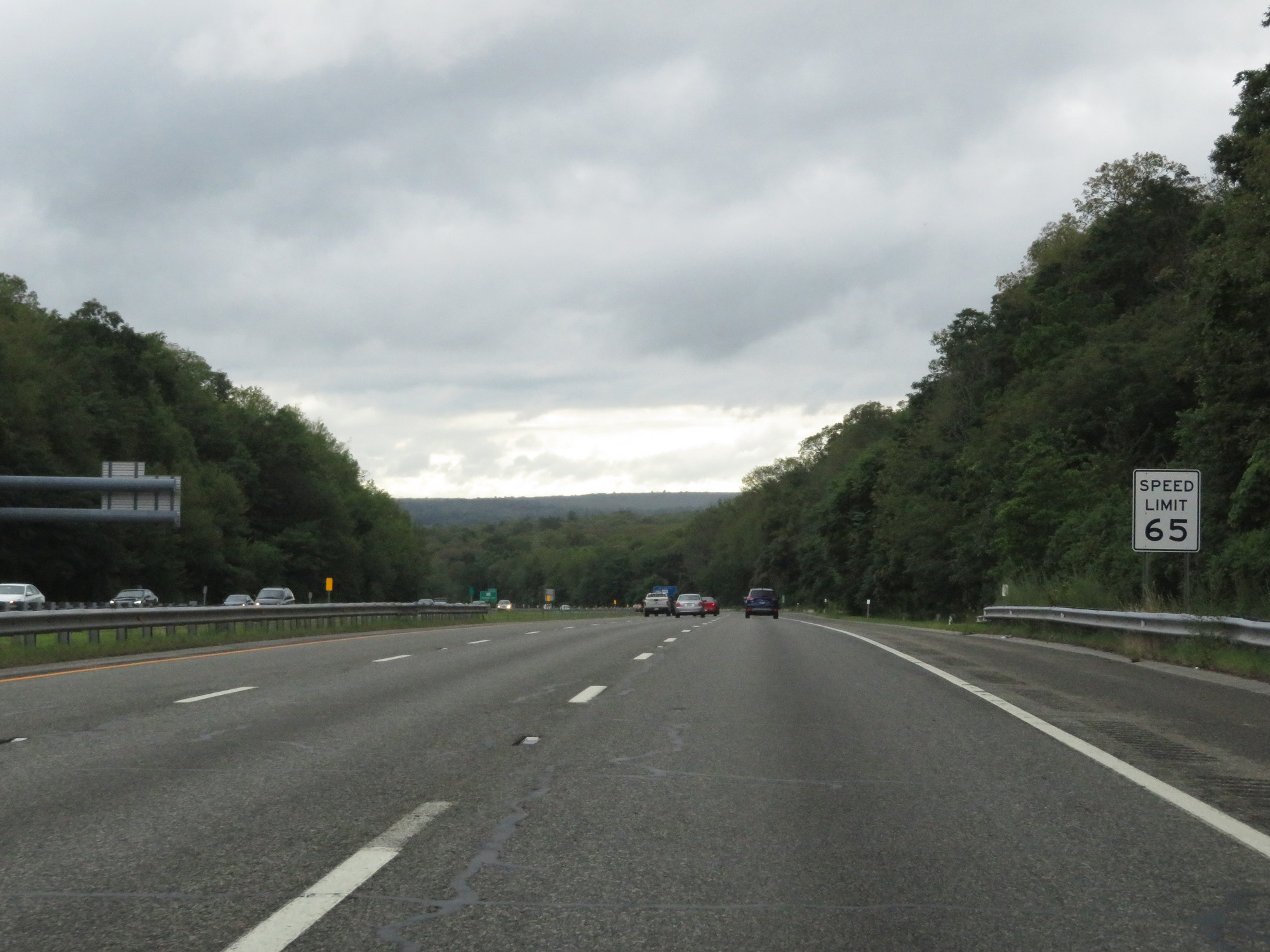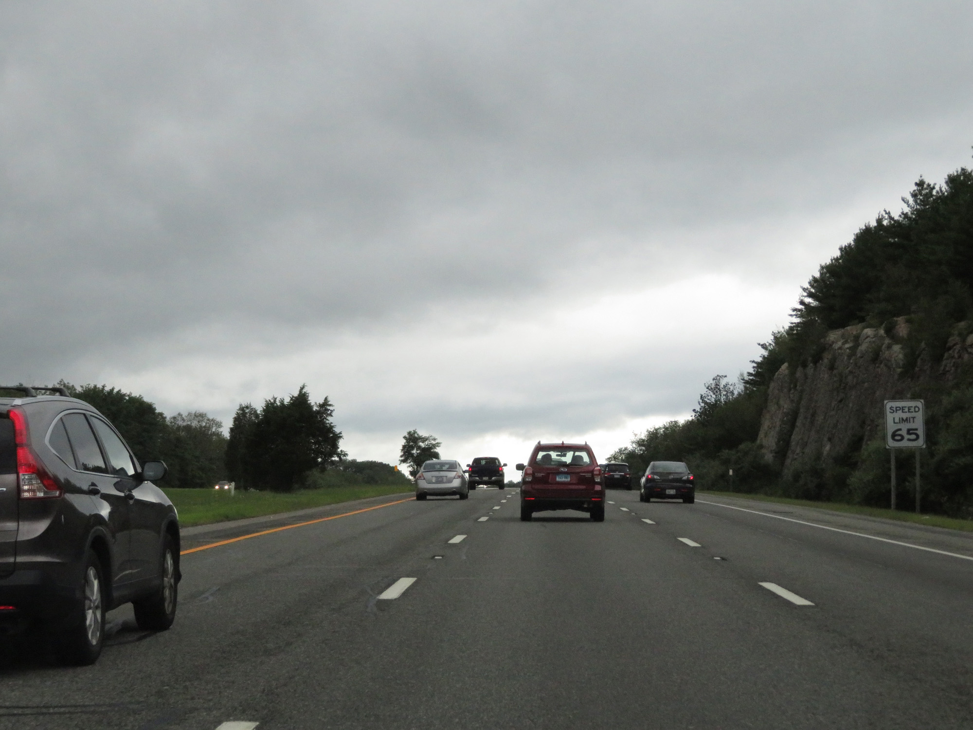 The speed limit on Interstate 295 South starts out at 65 mph, which is the standard speed limit on the rural stretches of Interstate highway in Rhode Island. (Photo taken 8/5/17).