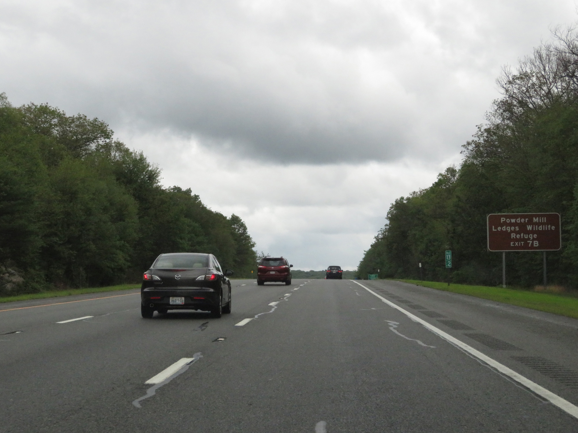 Take Exit 7B to Powder Mill Ledges Wildlife Refuge. Interstate 295 South reassurance shield. (Photo taken 8/5/17).