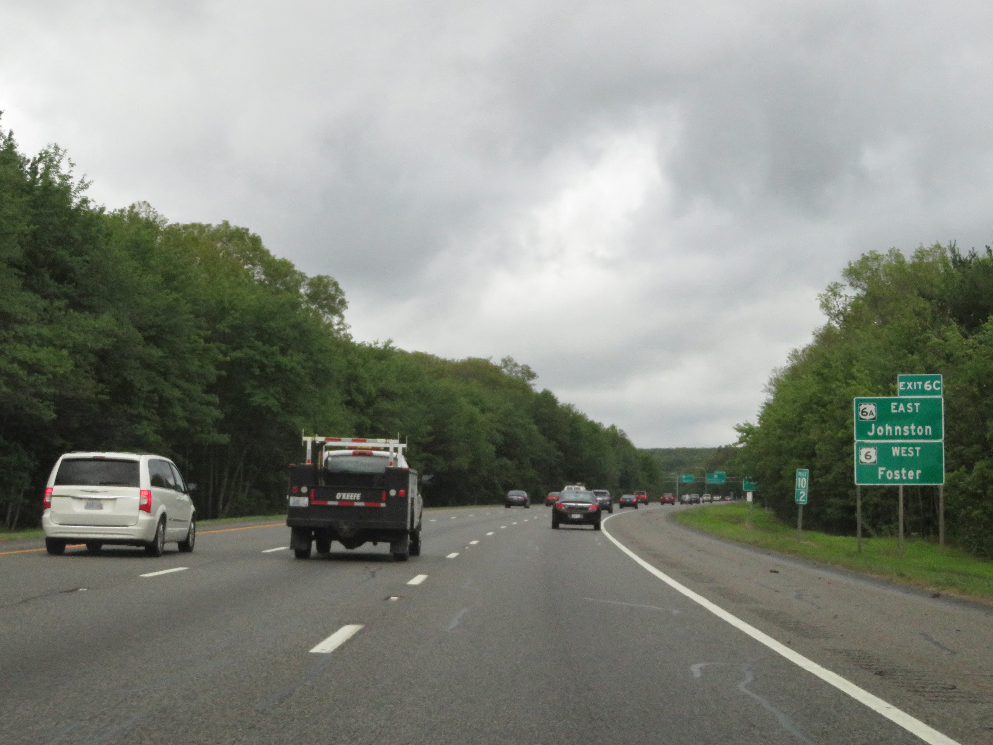 Take Exit 6C to US 6A East toward Johnston and US 6 West toward Foster. (Photo taken 8/5/17).