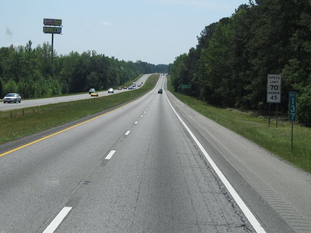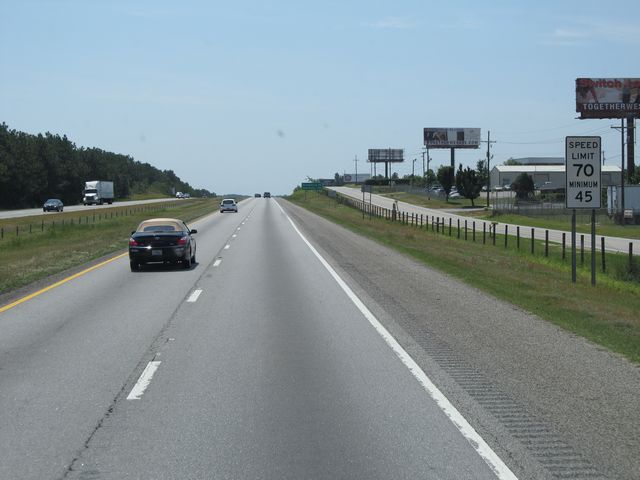 Speed limit sign located near mile marker 120.5. The speed limit on most rural South Carolina freeways is 70 mph, with a minimum speed limit of 45 mph. (Photo taken 4/24/11). |