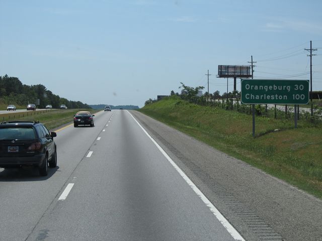 Mileage sign located near mile marker 121. It's 30 miles to Orangeburg and 100 miles to Charleston. (Photo taken 4/24/11). |