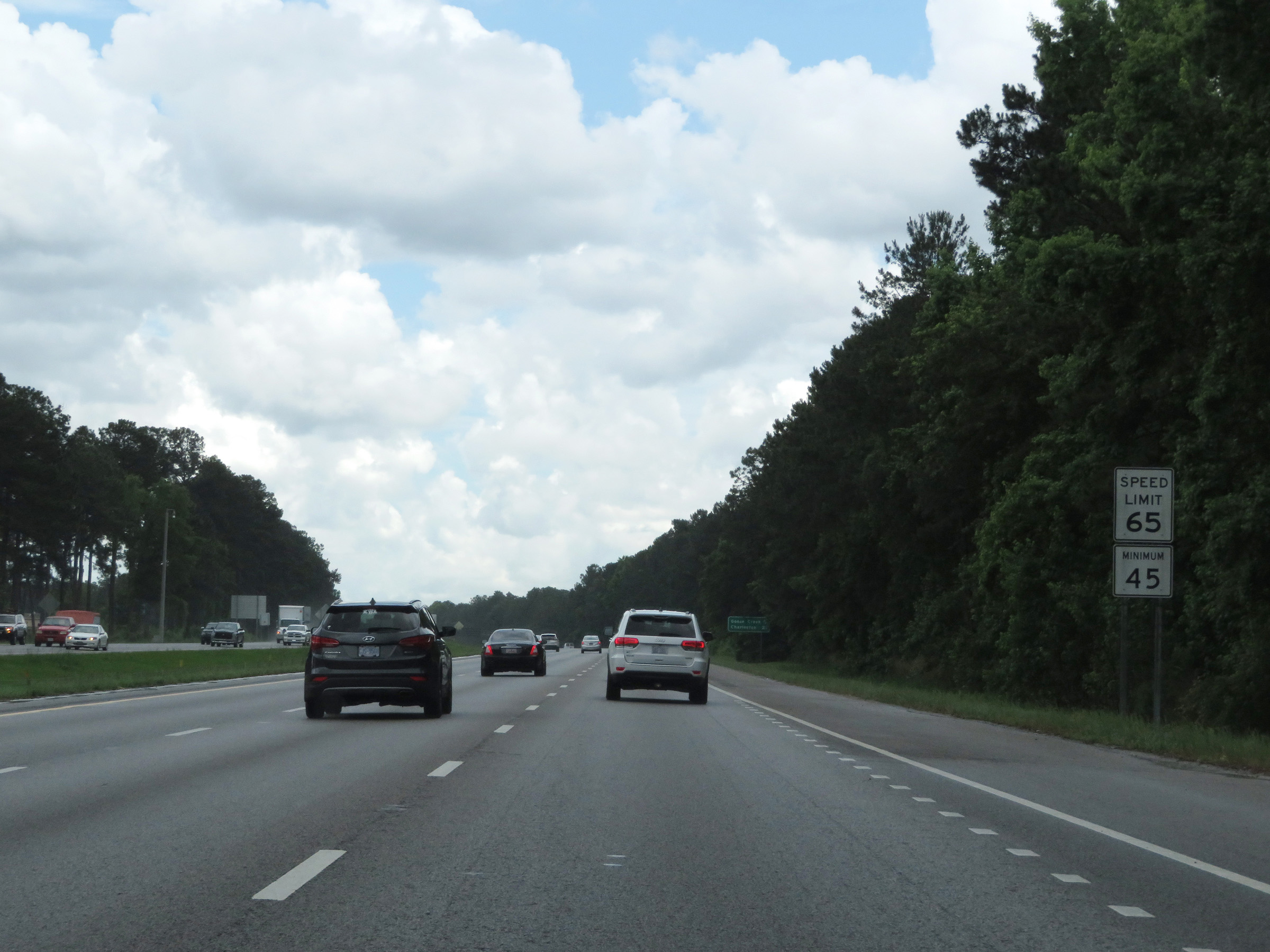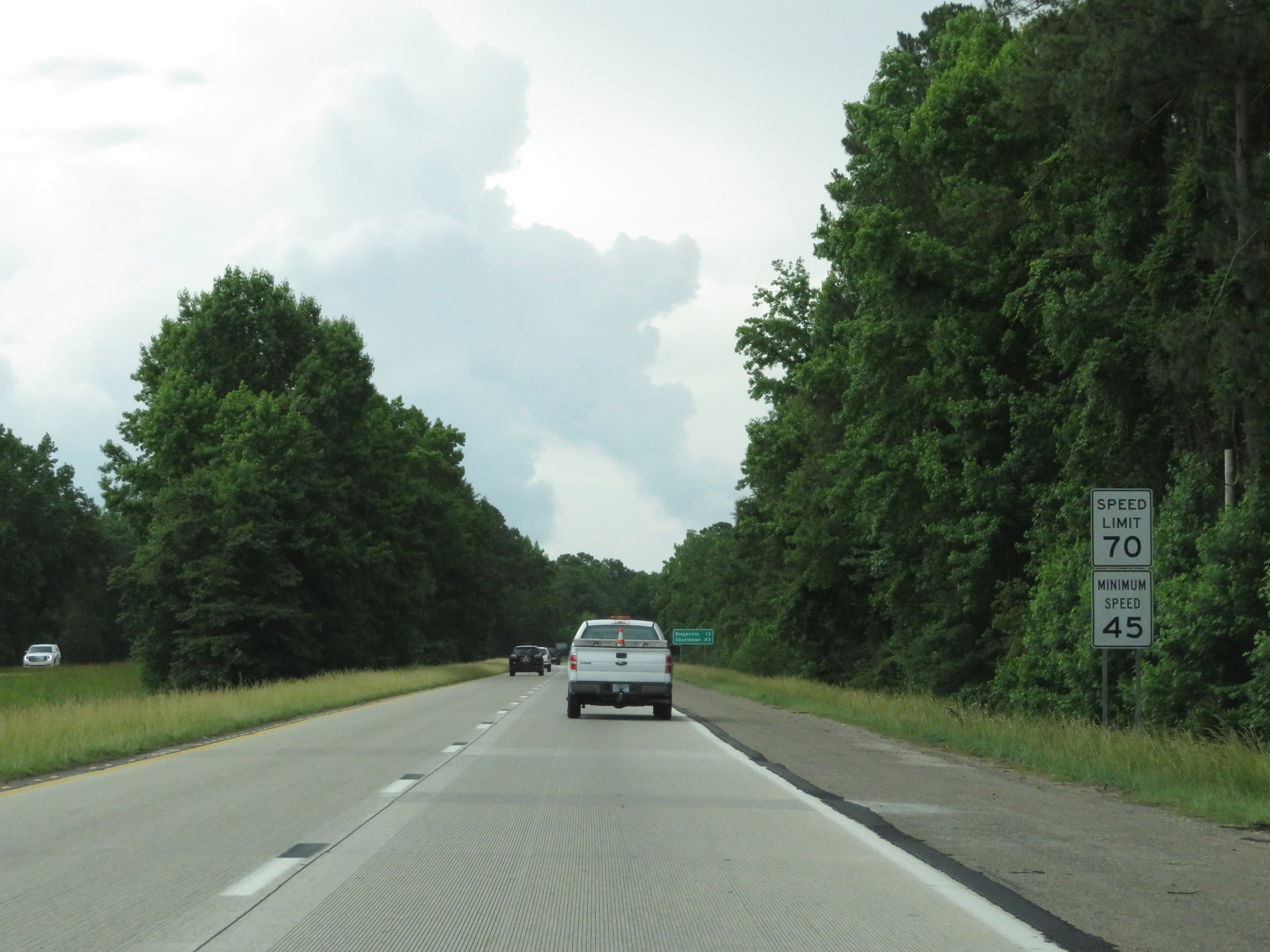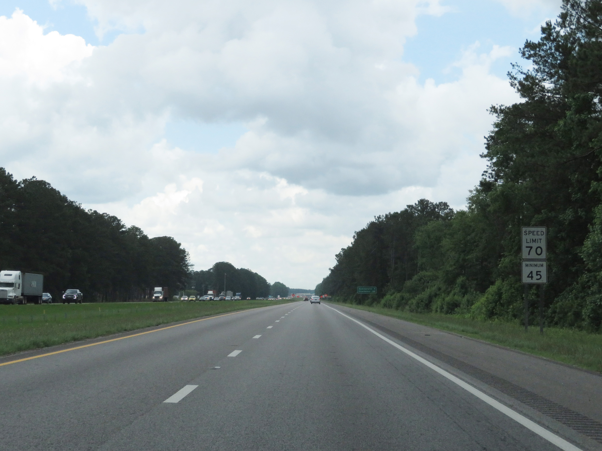 The speed limits remain 70 mph maximum and 45 mph minimum on Interstate 26 East. These are the standard speed limits on most rural Interstate highways in South Carolina. (Photo taken 5/25/18). |