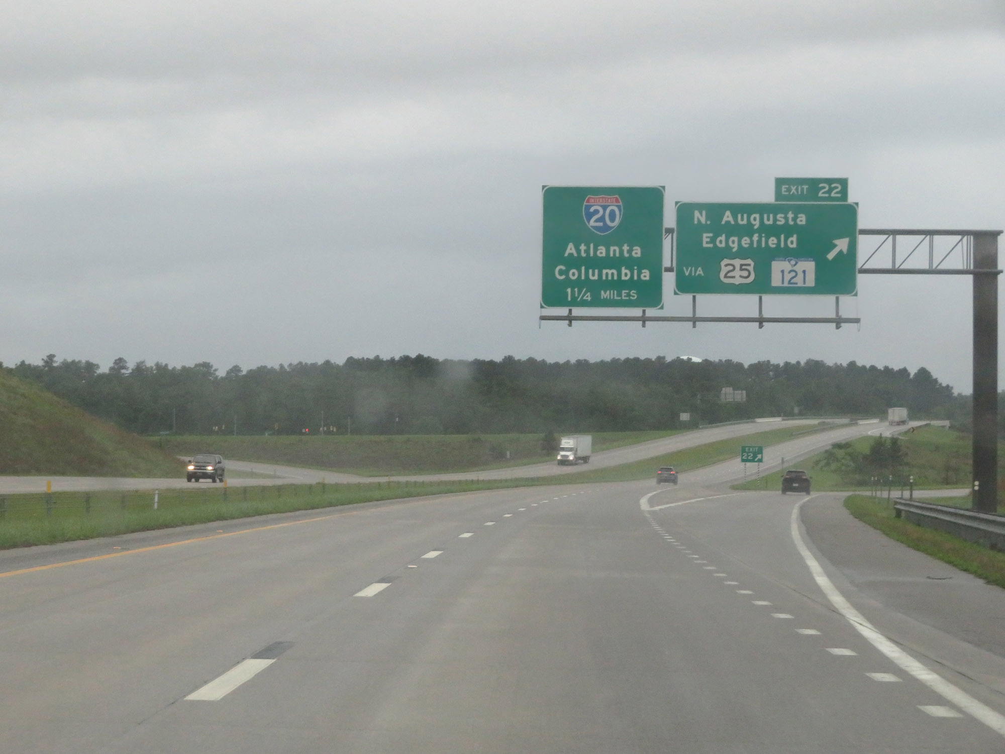 Interstate 520 East at Exit 22: SC 121 / To US 25 - North Augusta / Edgefield (Photo taken 5/25/18). |