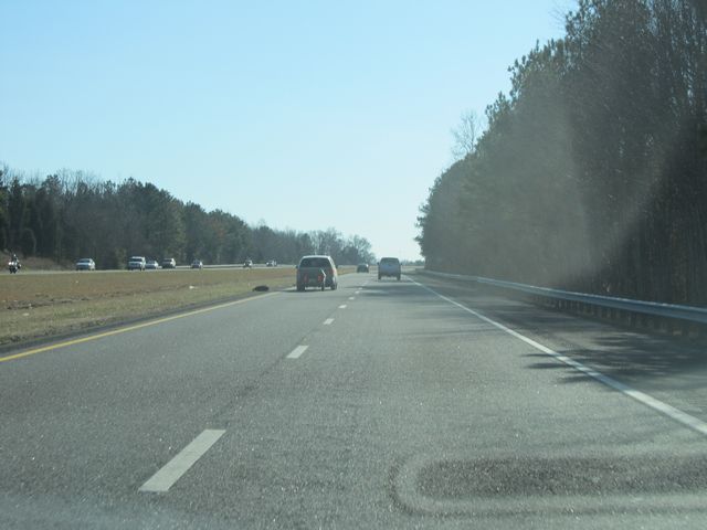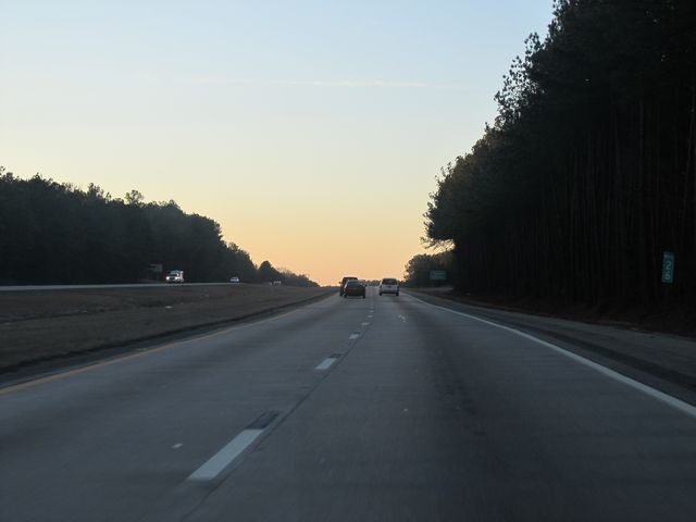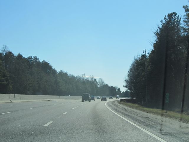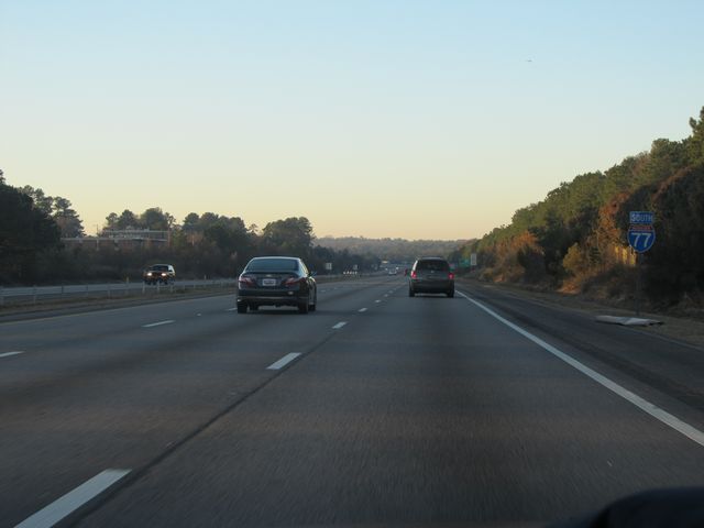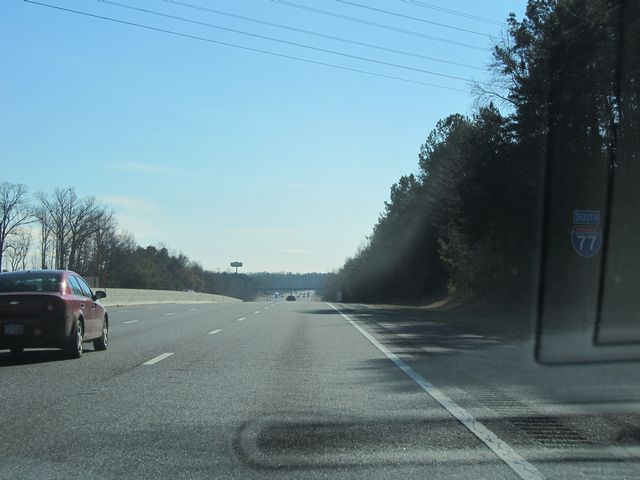 Interstate 77 South: Road view from mile marker 29. From the trees on the median, it finally looks like we're into the south! (Photo taken 1/22/11). |
