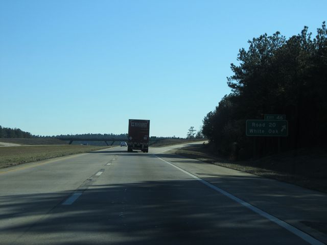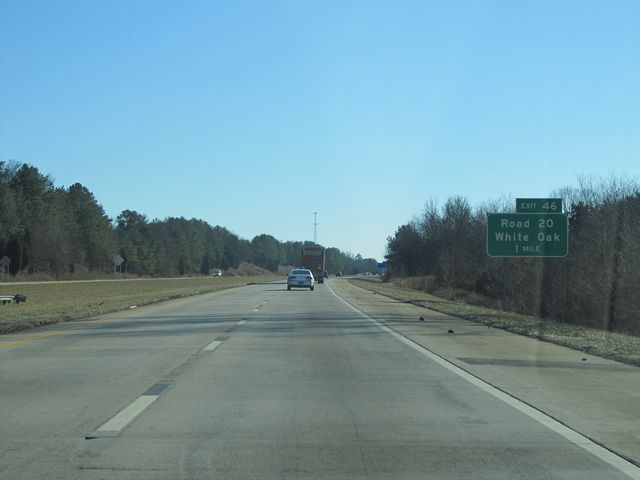 Interstate 77 South at Exit 46: Road 20 / White Oak. Sorry about this picture, but with the sunlight being as bright as it was and the sign being greatly shaded by the trees, it's the best I could do. (Photo taken 1/22/11). |