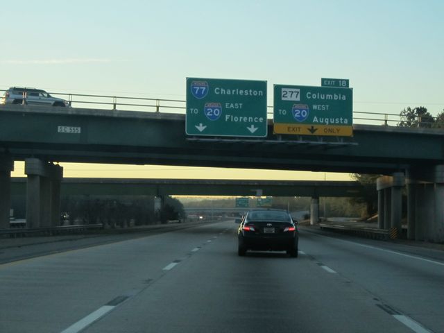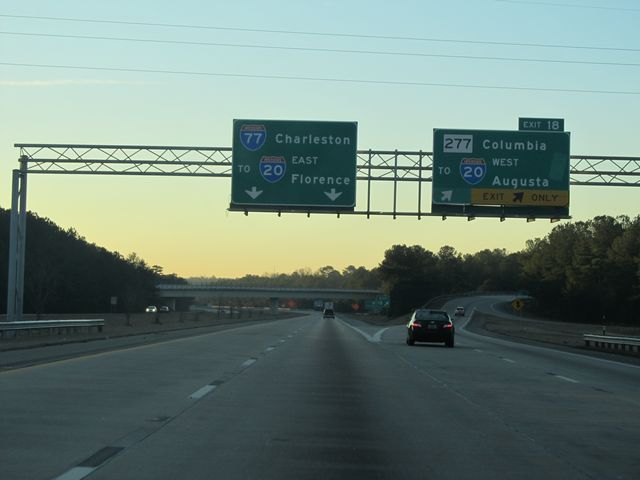 Interstate 77 South at Exit 18: SC 277 - Columbia; To Interstate 20 West - Augusta (Photo taken 1/23/11). |
