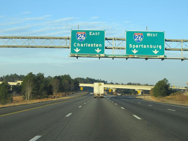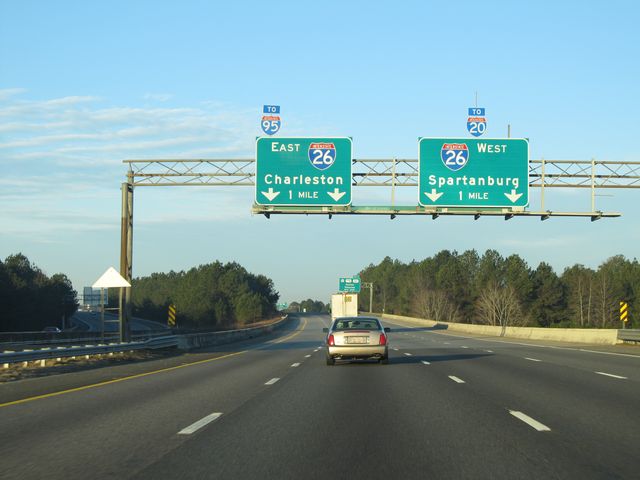 Interstate 77 South approaching its southern terminus at Interstate 26 - 1 mile. As the signs say, use I-26 West to get to Interstate 20 and use I-26 East to get to Interstate 95. (Photo taken 1/23/11). |