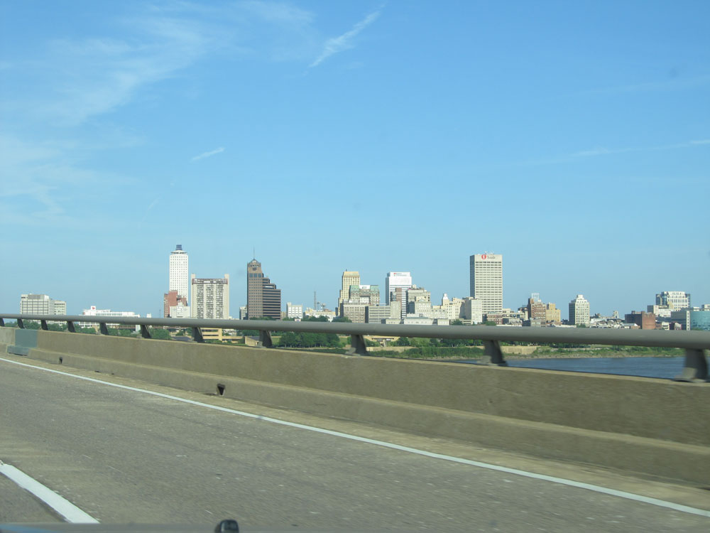 A view of the Memphis skyline from Interstate 40 East as it begins to cross the Mississippi River from Arkansas into Tennessee. (Photo taken 5/23/15).