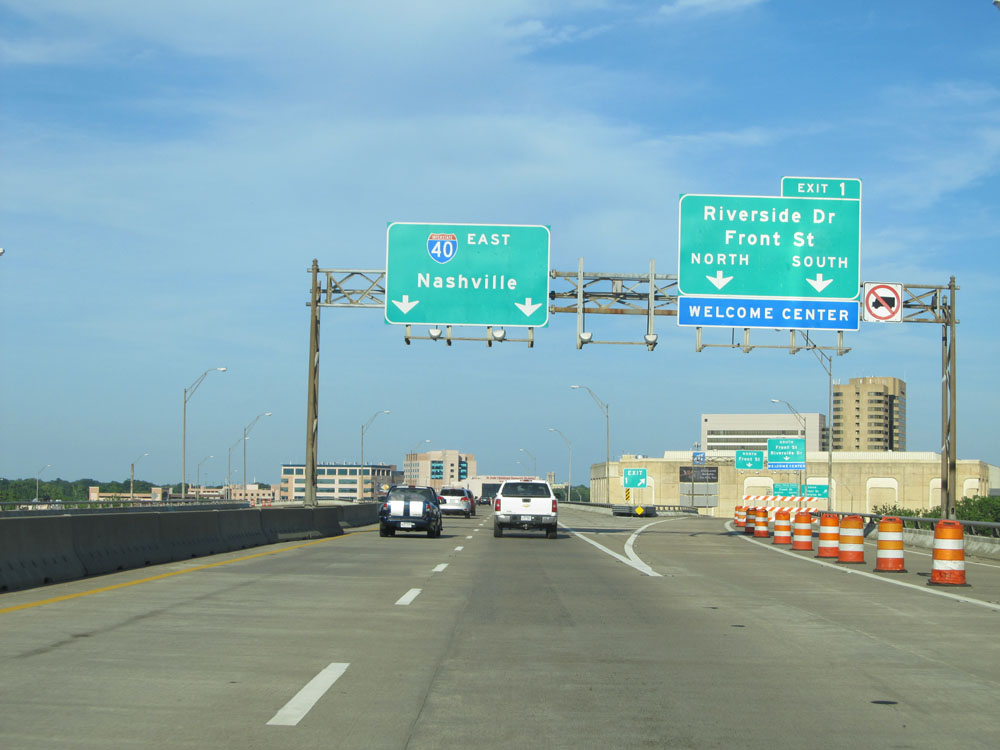 Interstate 40 East at Exit 1: Riverside Dr / Front St (Photo taken 5/23/15).