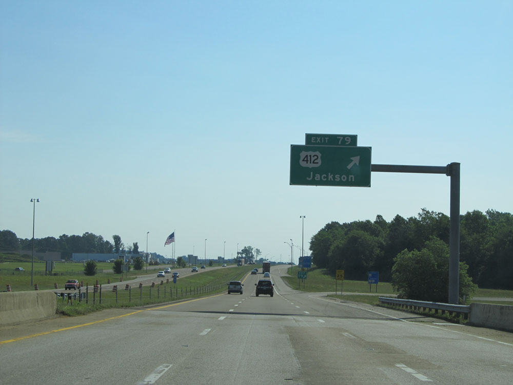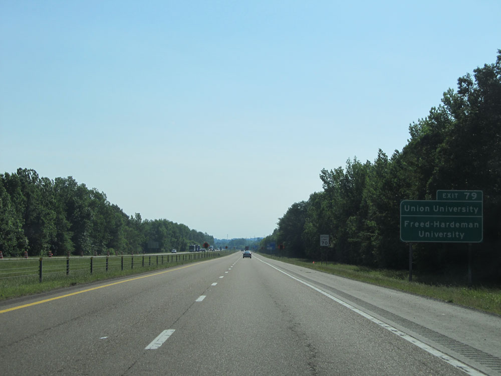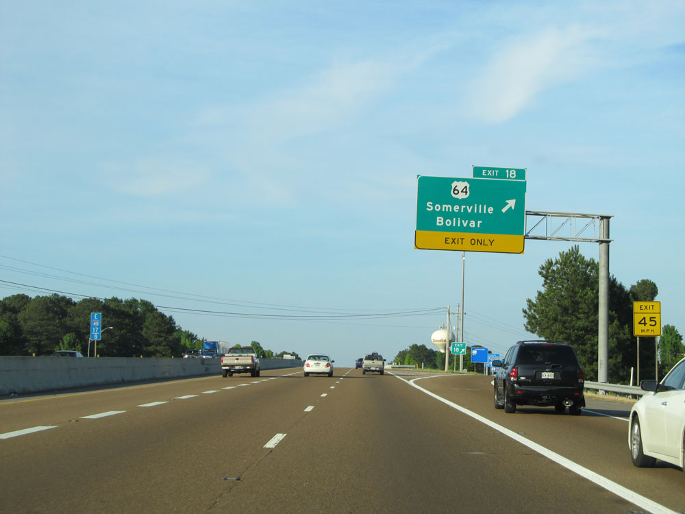 Interstate 40 East at Exit 18: US 64 - Somerville / Bolivar (Photo taken 5/23/15).