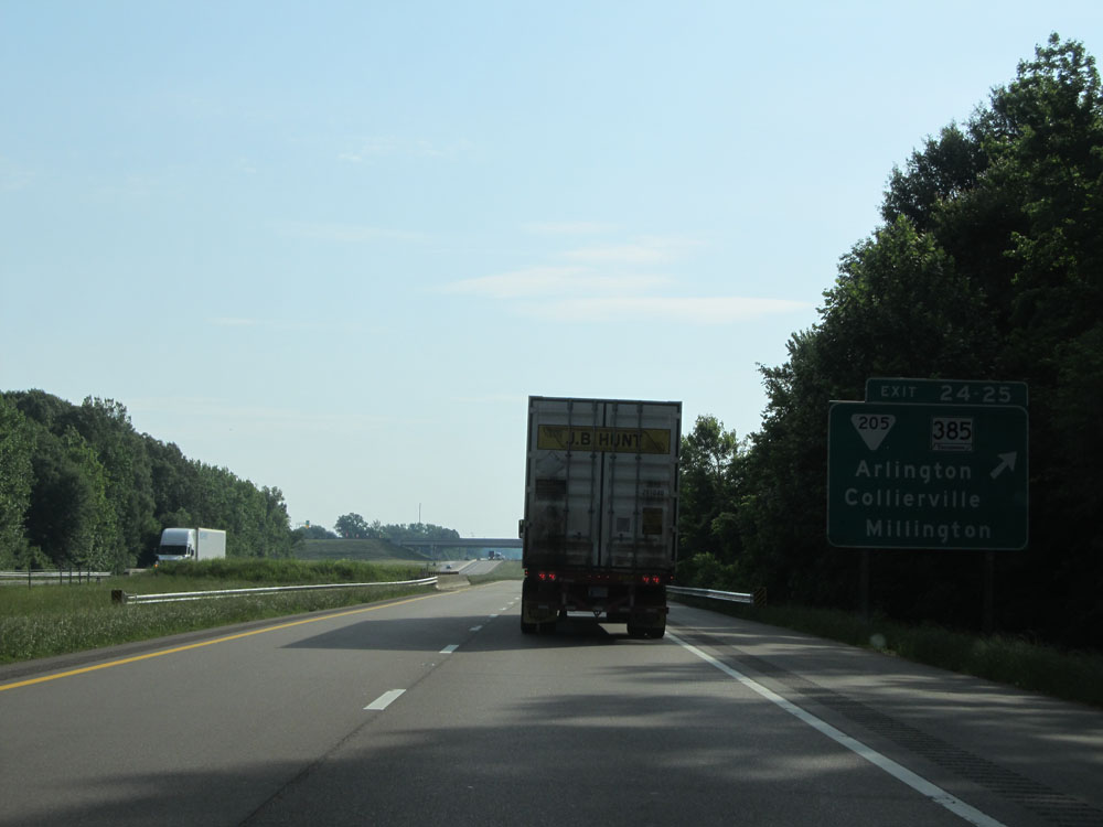 Interstate 40 East at Exit 24: TN 385 - Collierville / Millington; Exit 25: SR 205 - Arlington (Photo taken 5/24/15).