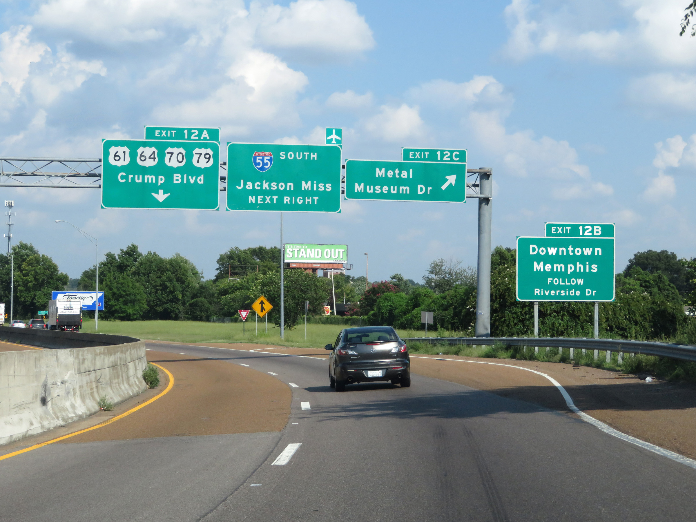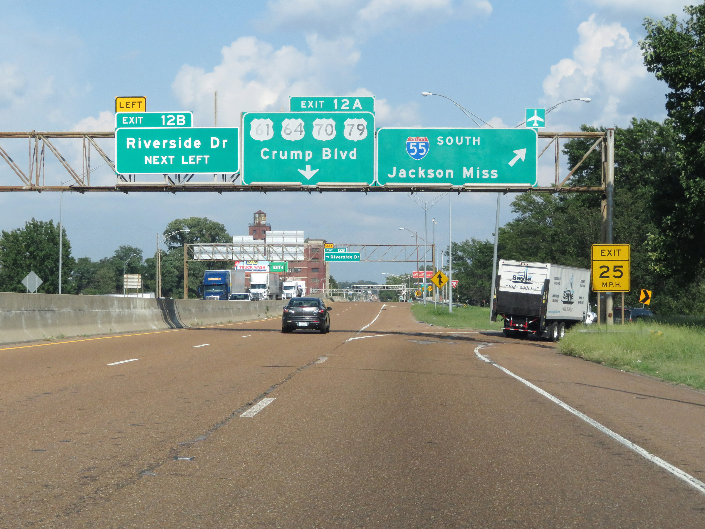 Interstate 55 South at Exit 12B: Riverside Dr; Exit 12A: US 61 / US 64 / US 70 / US 79 - Crump Blvd (Photo taken 8/12/19). |