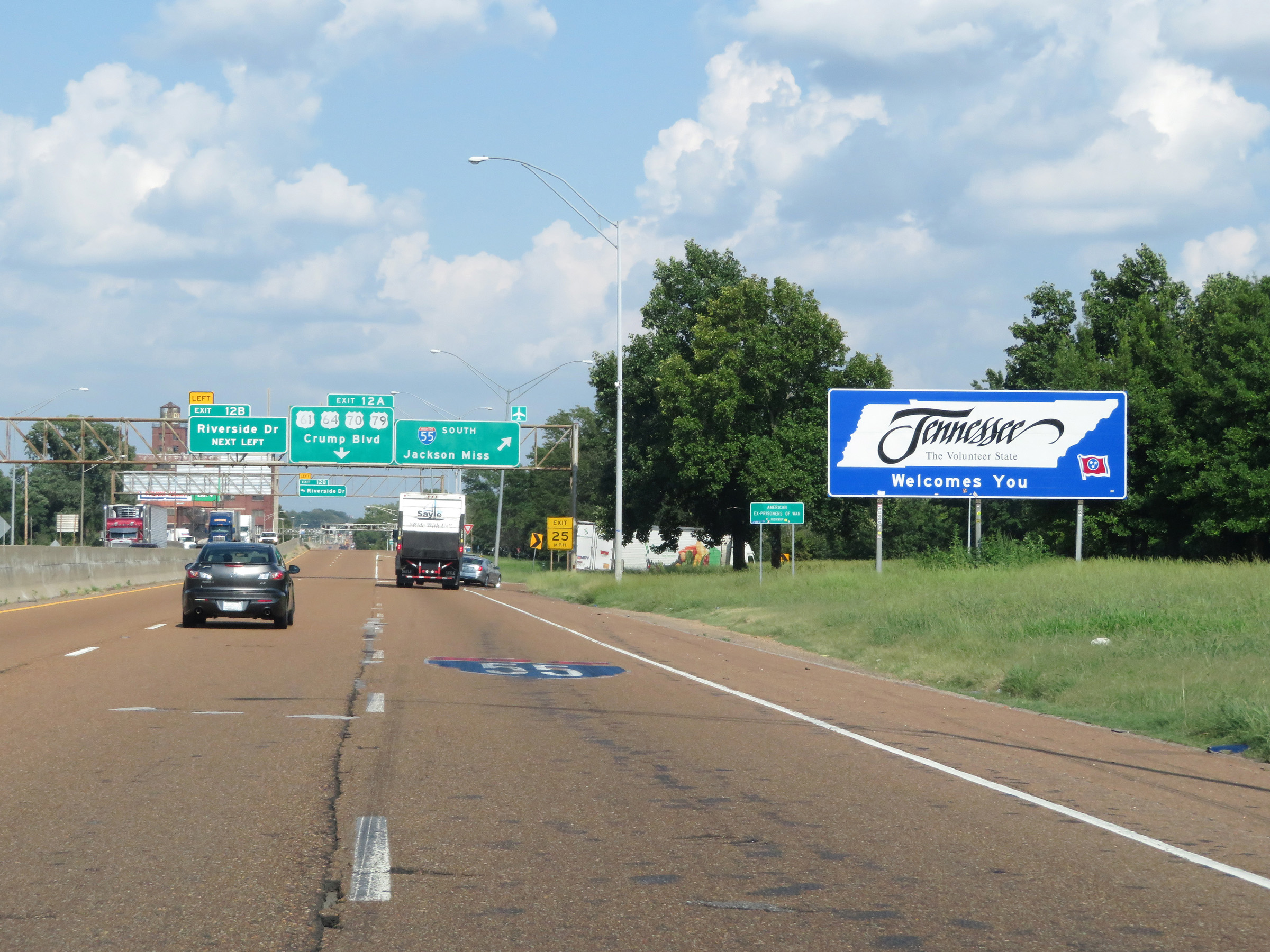 Tennessee welcome sign on Interstate 55 South in downtown Memphis. To remain on I-55 South, you must use the right lane ahead. (Photo taken 8/12/19). |