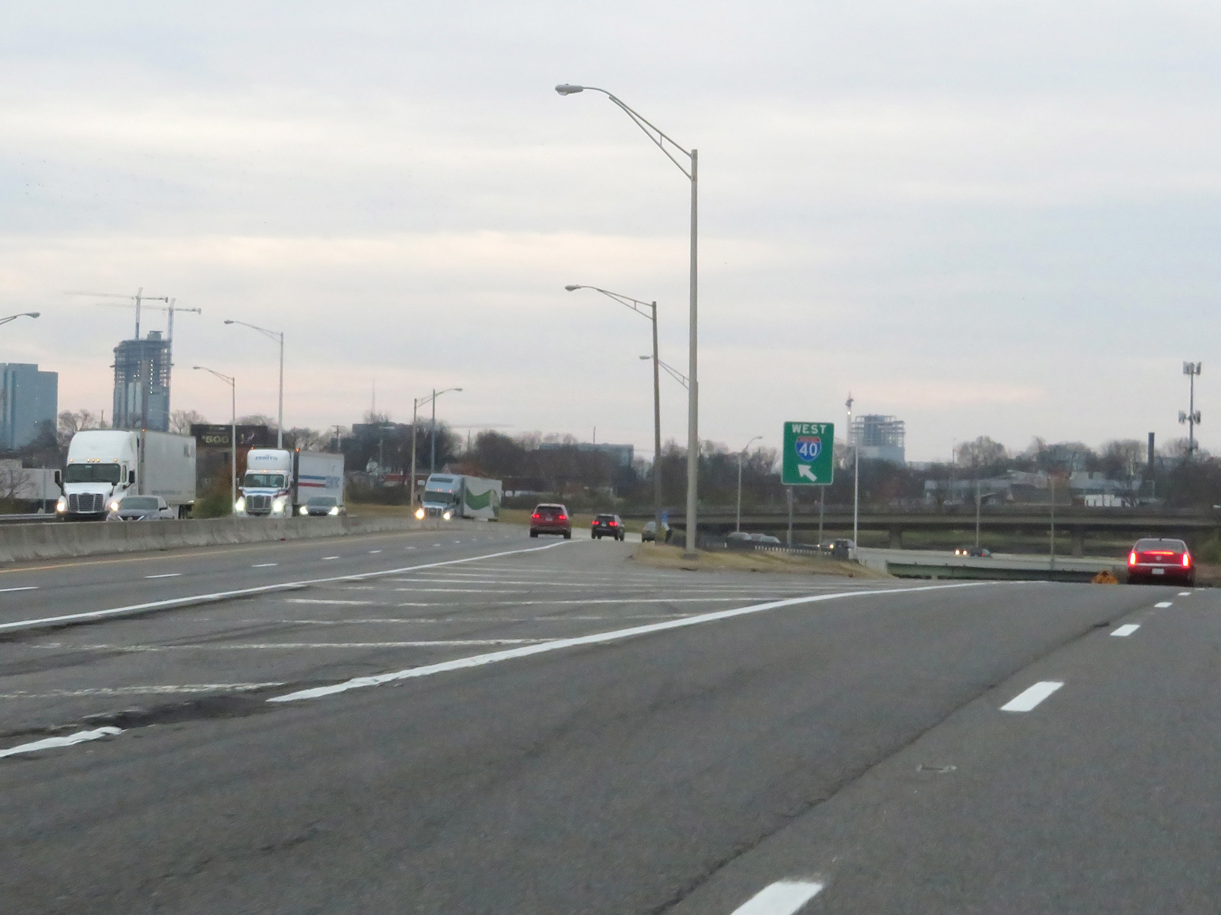 As Interstate 65 South curves to the east and passes under Jefferson St, its two lanes prepare to combine with the two thru lanes of Interstate 40 East ahead. I-40 East traffic will join from the right. (Photo taken 12/13/20). |