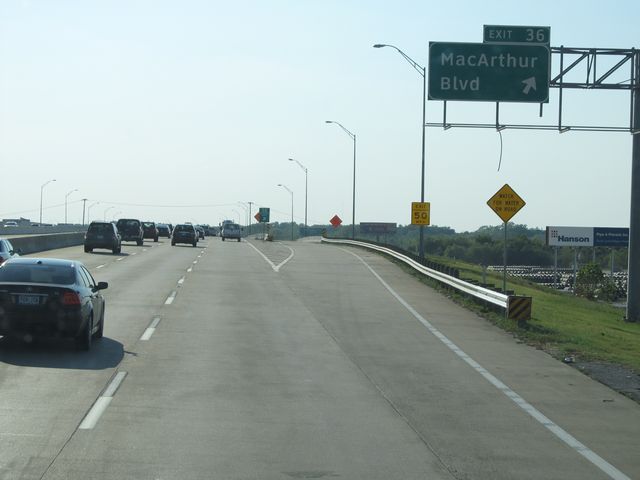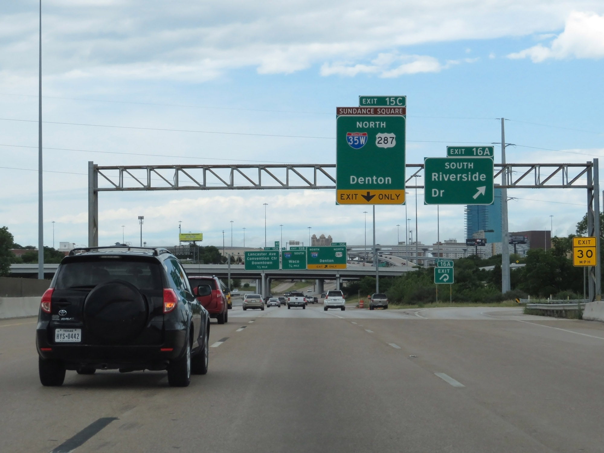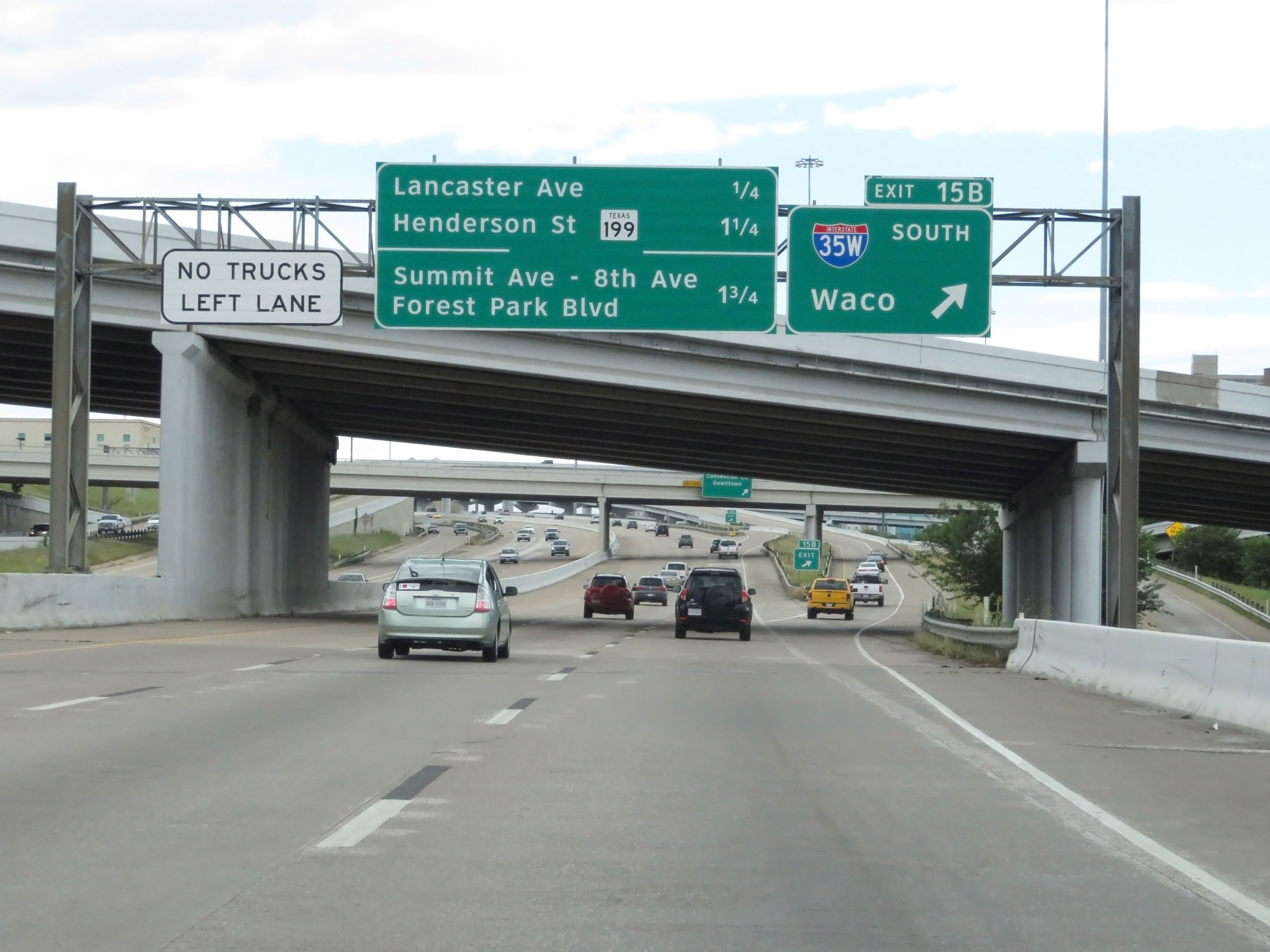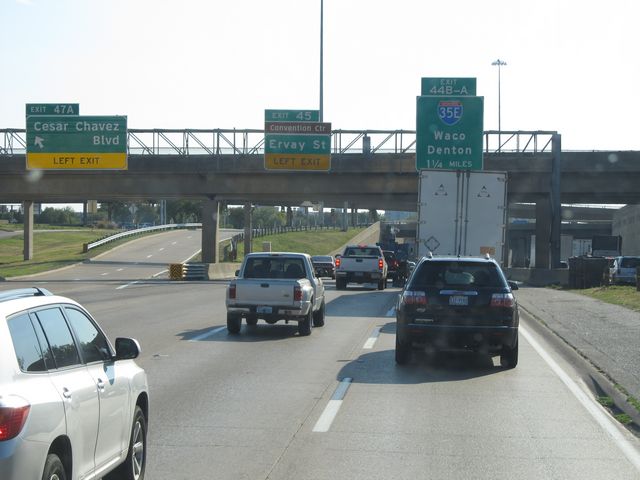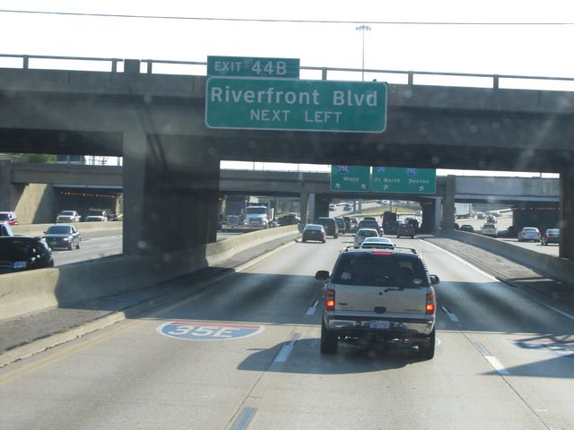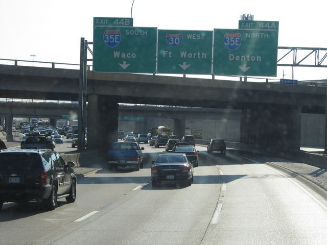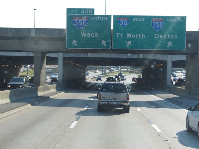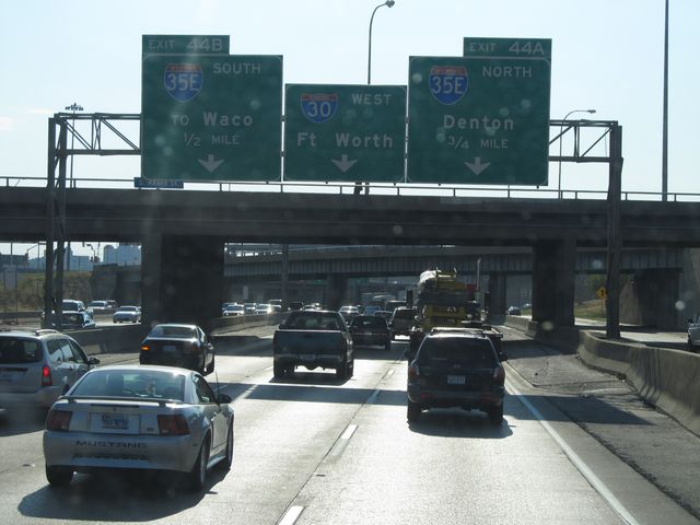 |  | Things get a little bit hectic here. If you are taking Exit 44B (Interstate 35E South - Waco), you should get in the leftmost lane. To stay on Interstate 30 West, get in the center lane. For Exit 44A (Interstate 35E North - Denton), stay in the rightmost lane.  (Photo taken 9/21/11). |