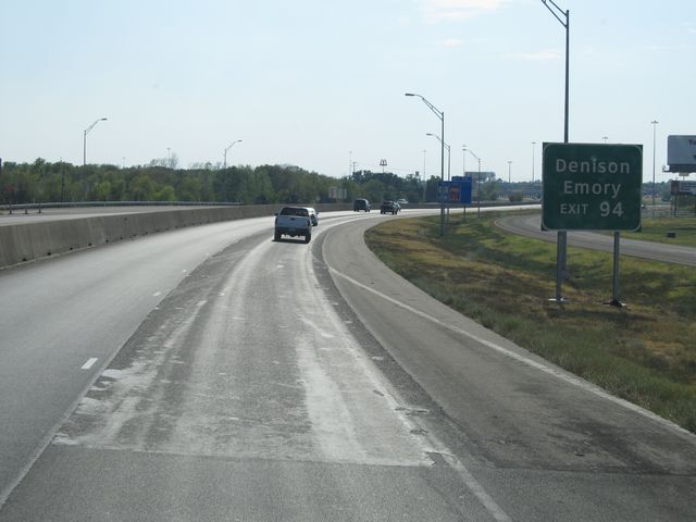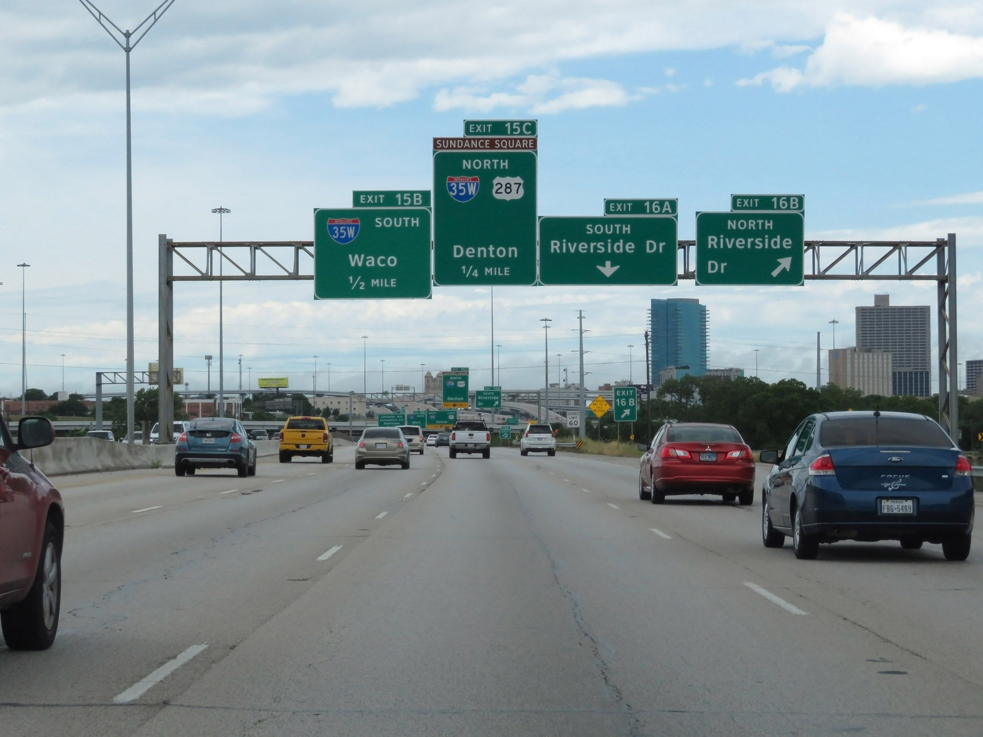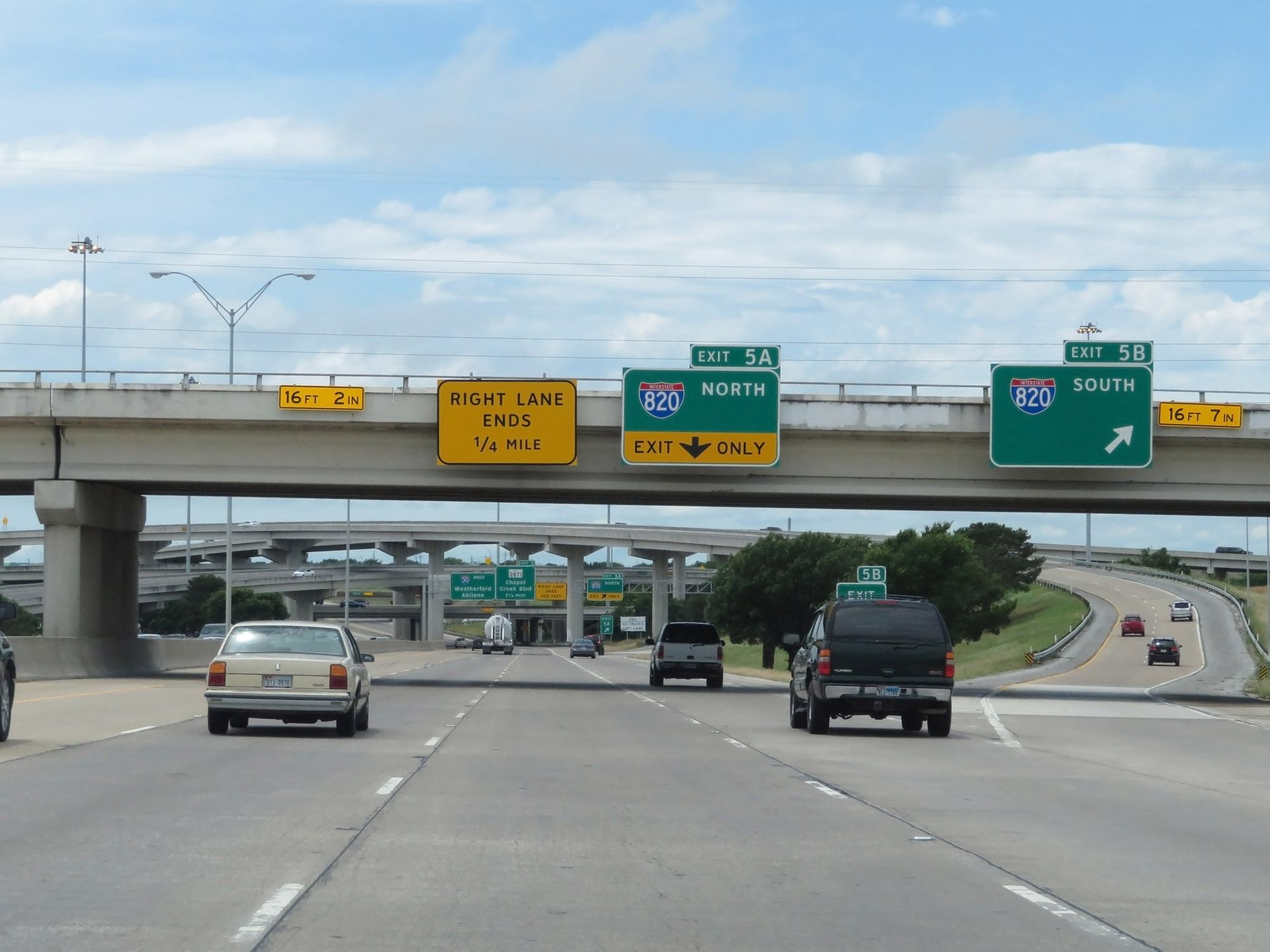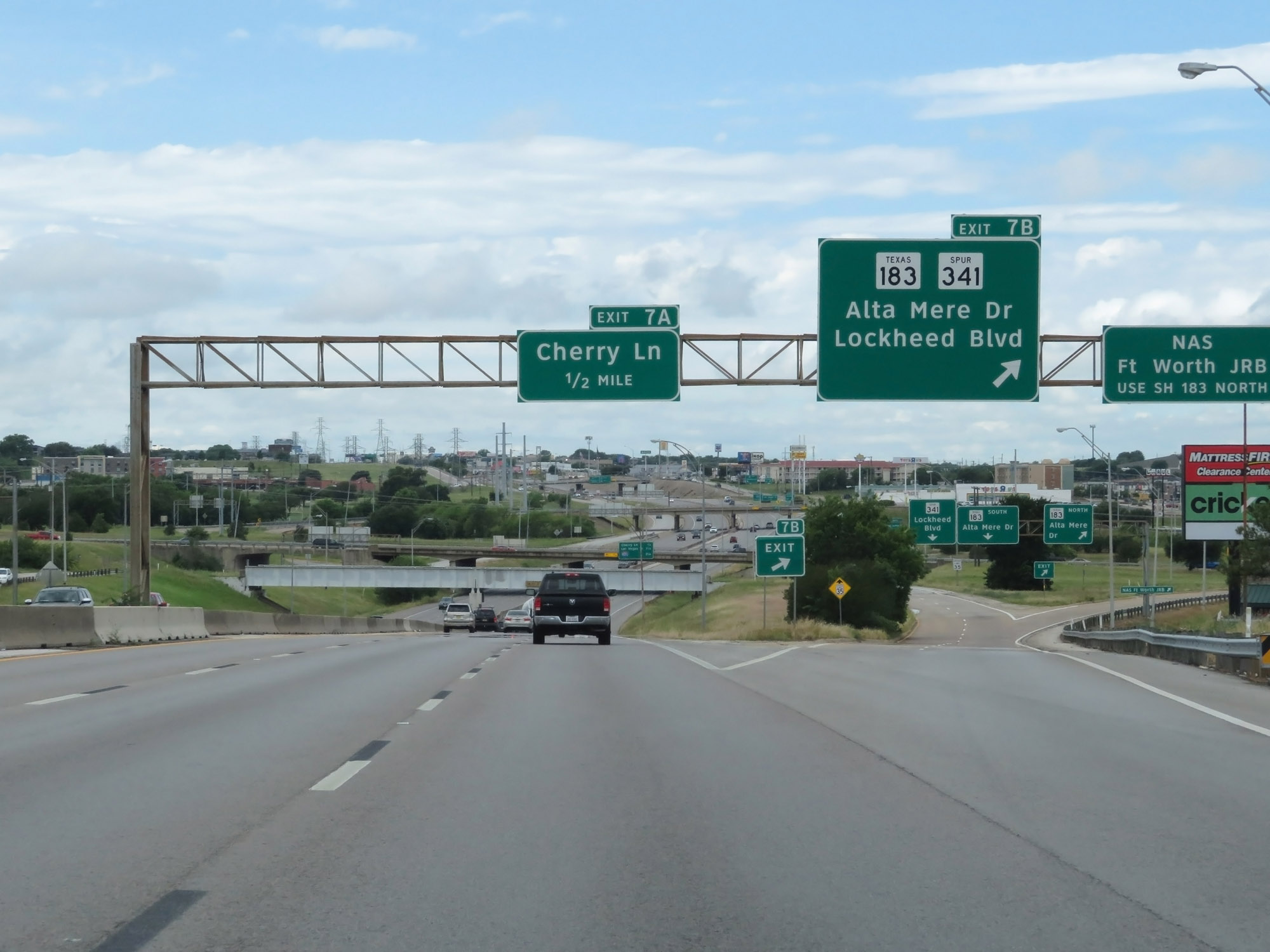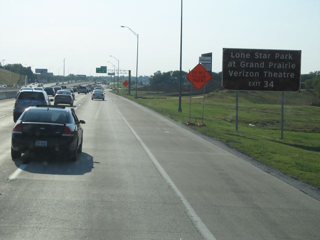 |  | Things get a little bit hectic here. If you are taking Exit 44B (Interstate 35E South - Waco), you should get in the leftmost lane. To stay on Interstate 30 West, get in the center lane. For Exit 44A (Interstate 35E North - Denton), stay in the rightmost lane.  (Photo taken 9/21/11). |