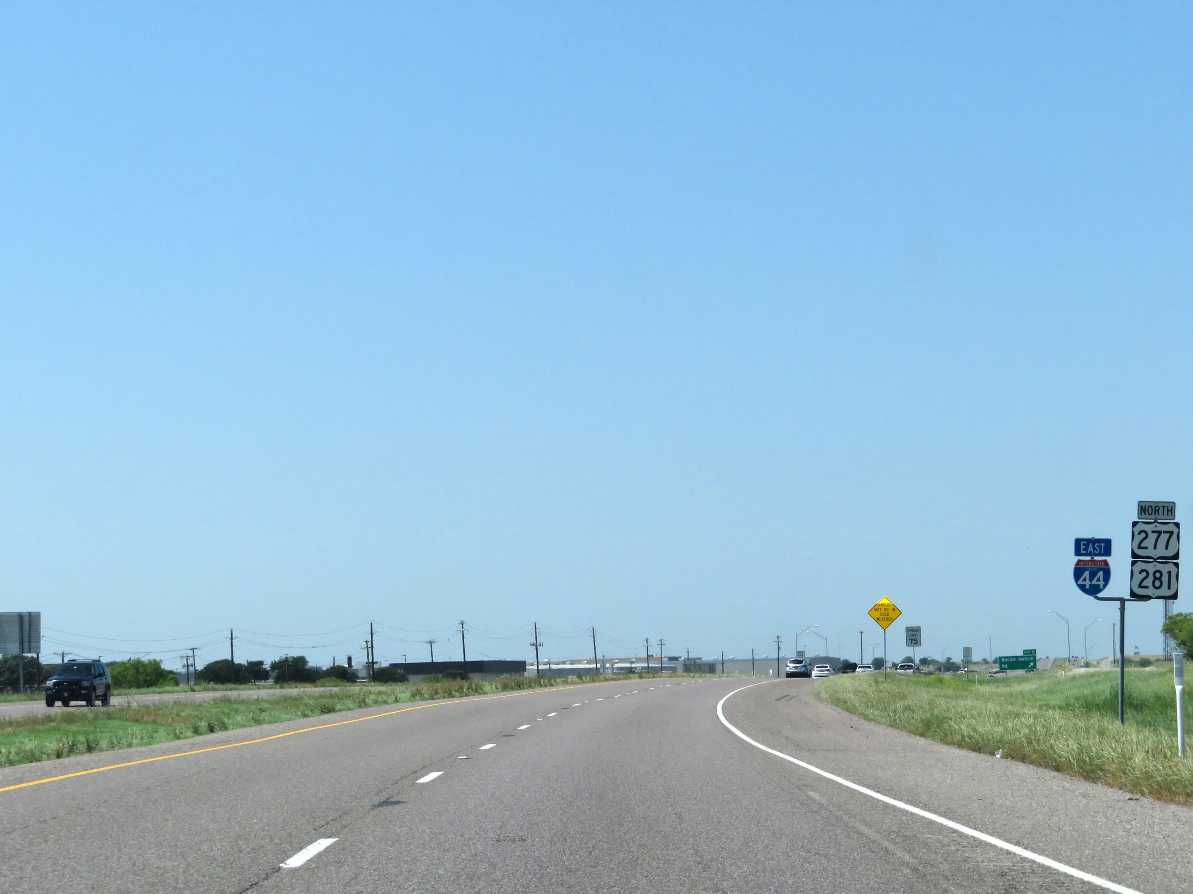 Beyond Exit 3B, the speed limit increases to 75 mph on Interstate 44 East. This is the standard speed limit on a lot of rural Interstate highways in Texas. (Photo taken 5/18/18). |
