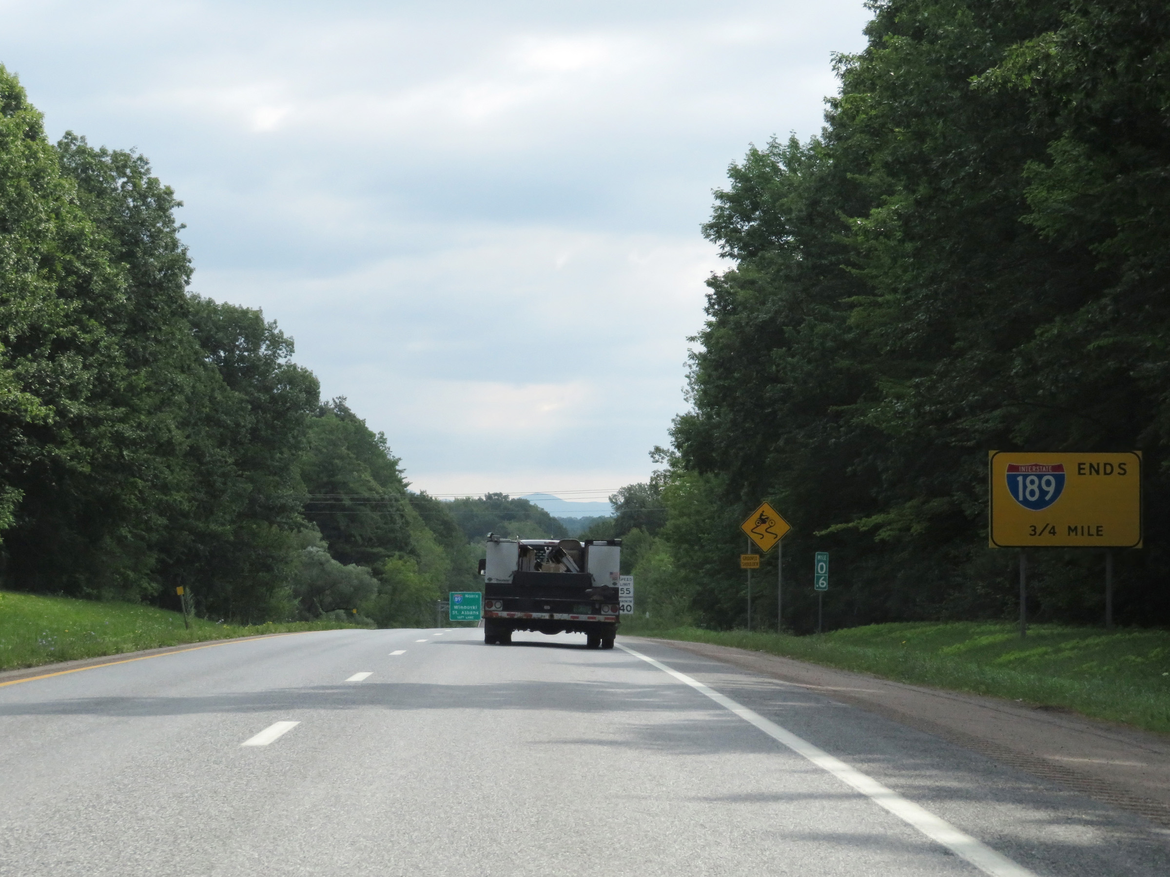 At mile marker 0.6, this sign warns that Interstate 189 East ends 3/4 mile ahead, which is at the junction of Interstate 89. (Photo taken 8/9/17). |