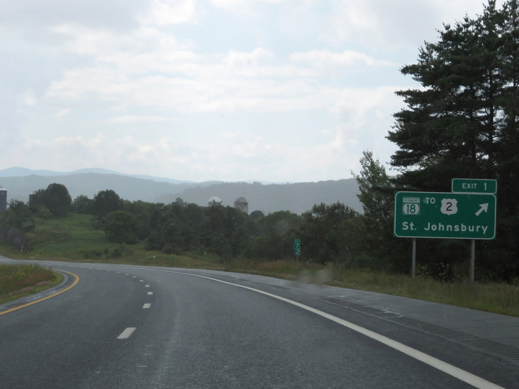 Interstate 93 North at Exit 1: VT 18 / To US 2 - St. Johnsbury (Photo taken 8/8/17). |