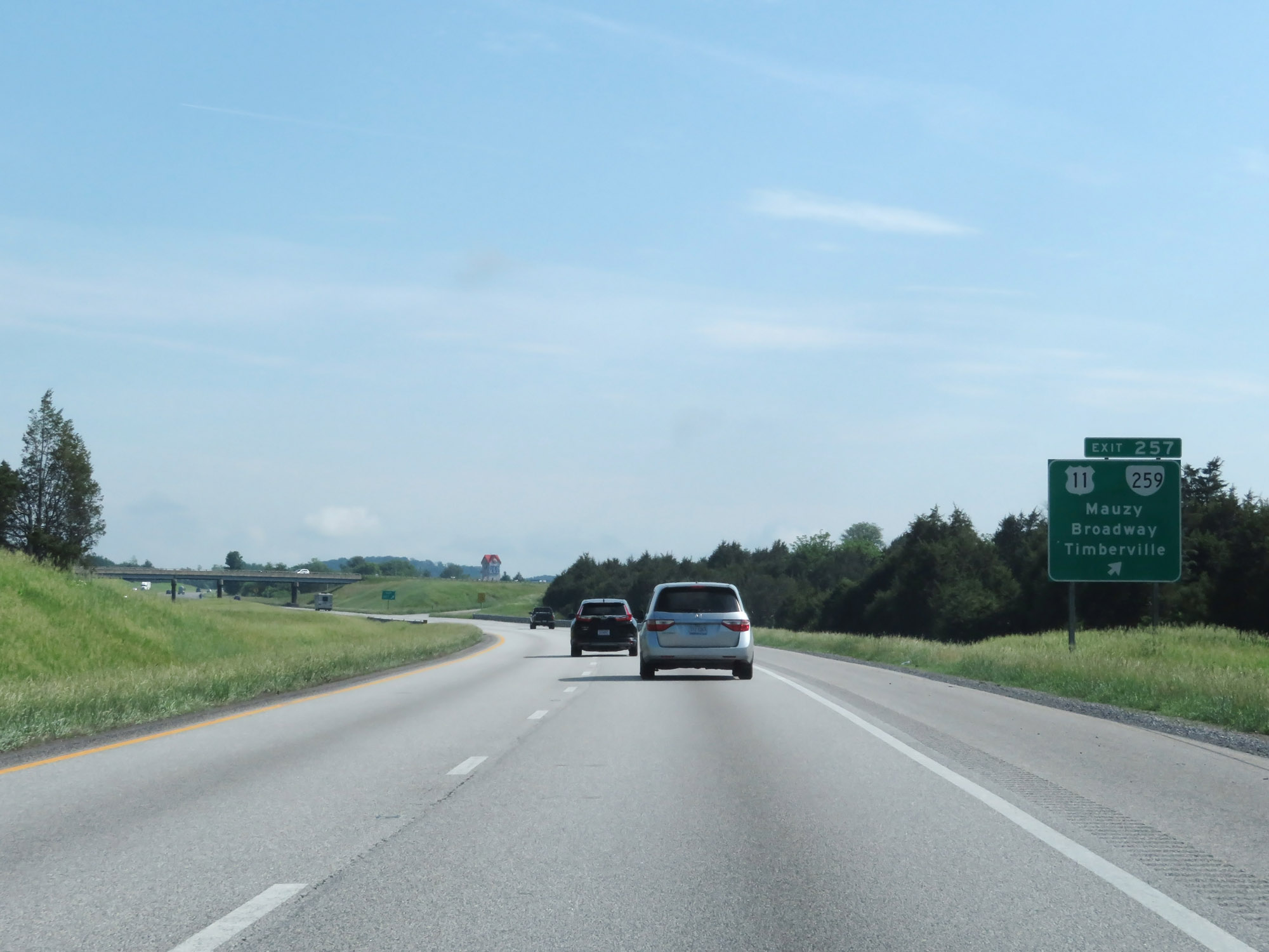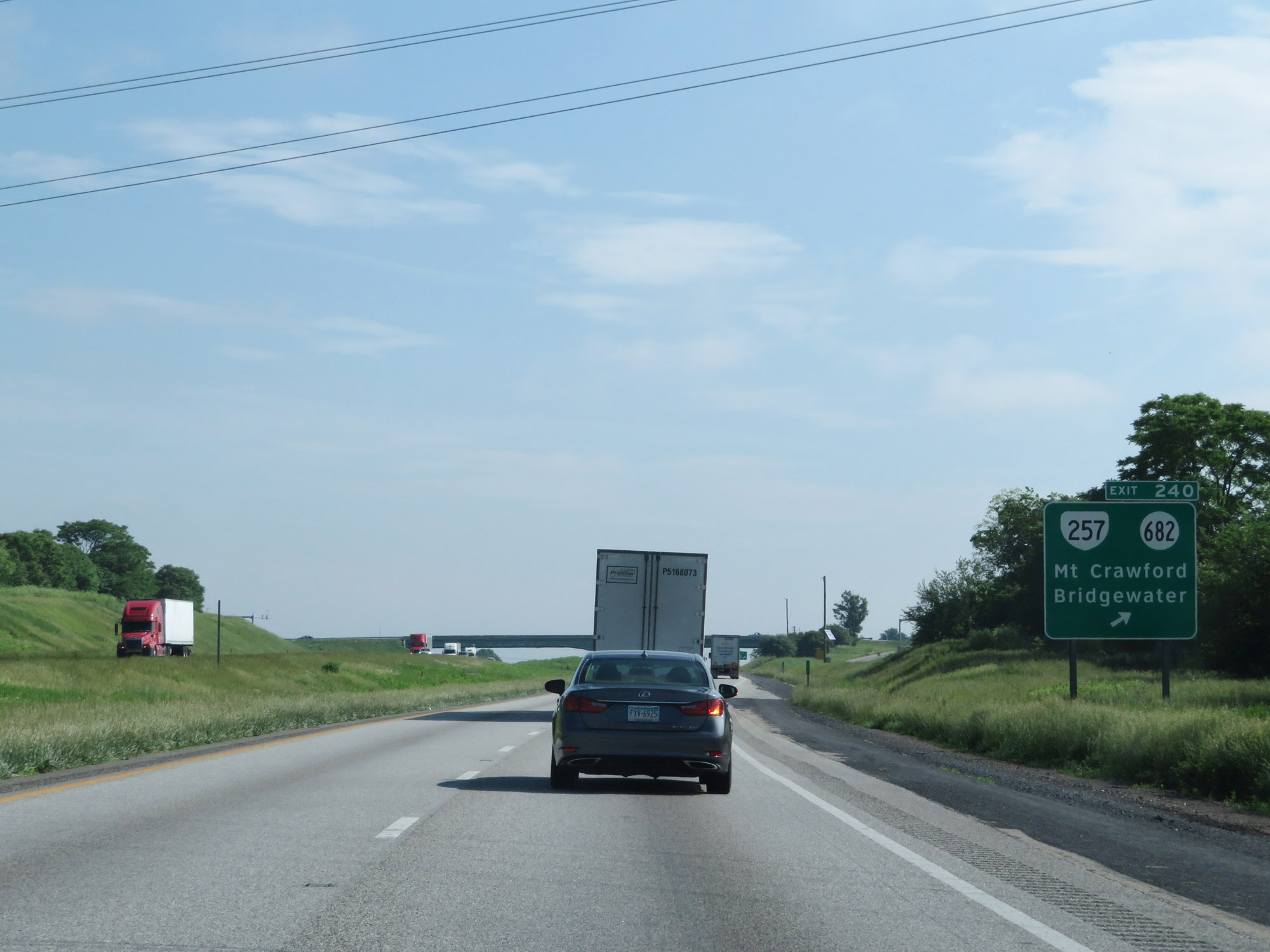 Interstate 81 North at Exit 257: US 11 / VA 259 - Mauzy / Broadway / Timberville (Photo taken 5/27/18). |