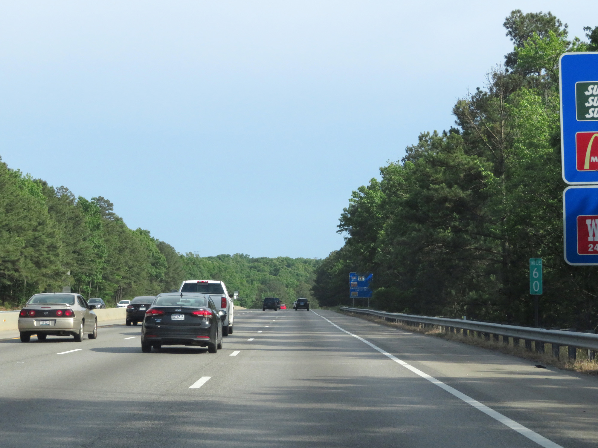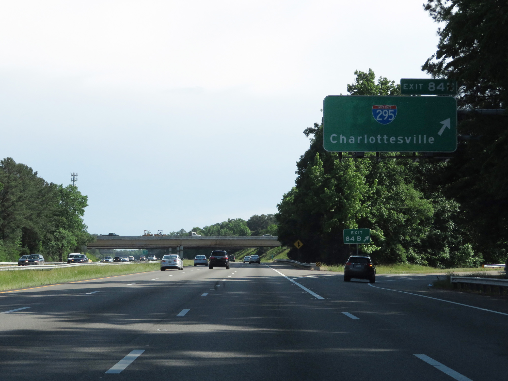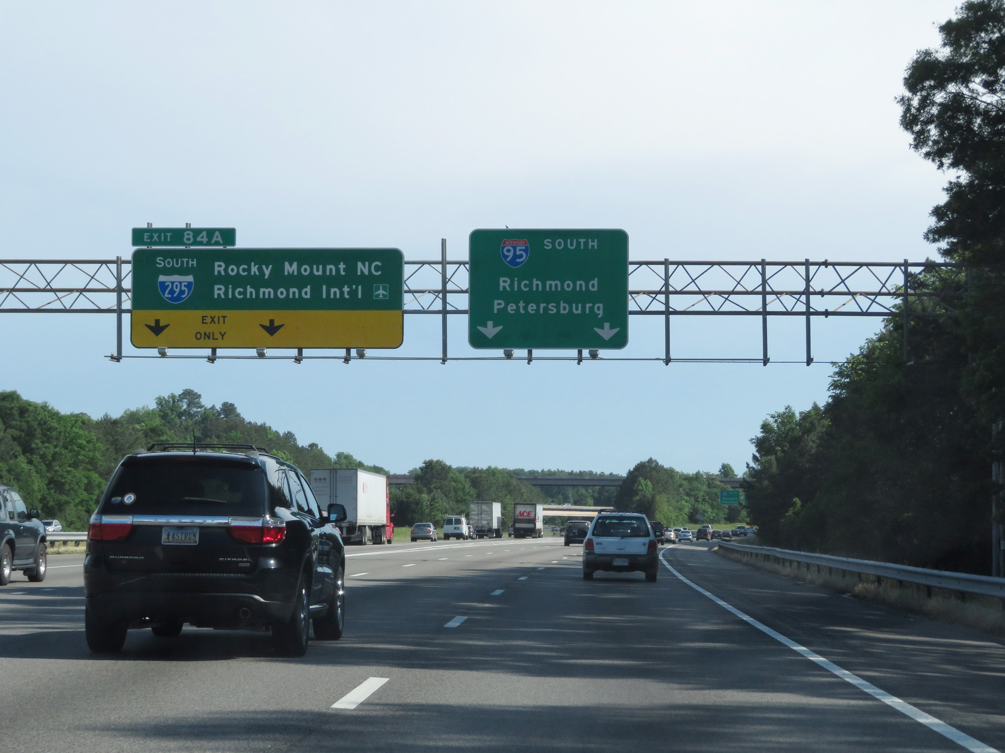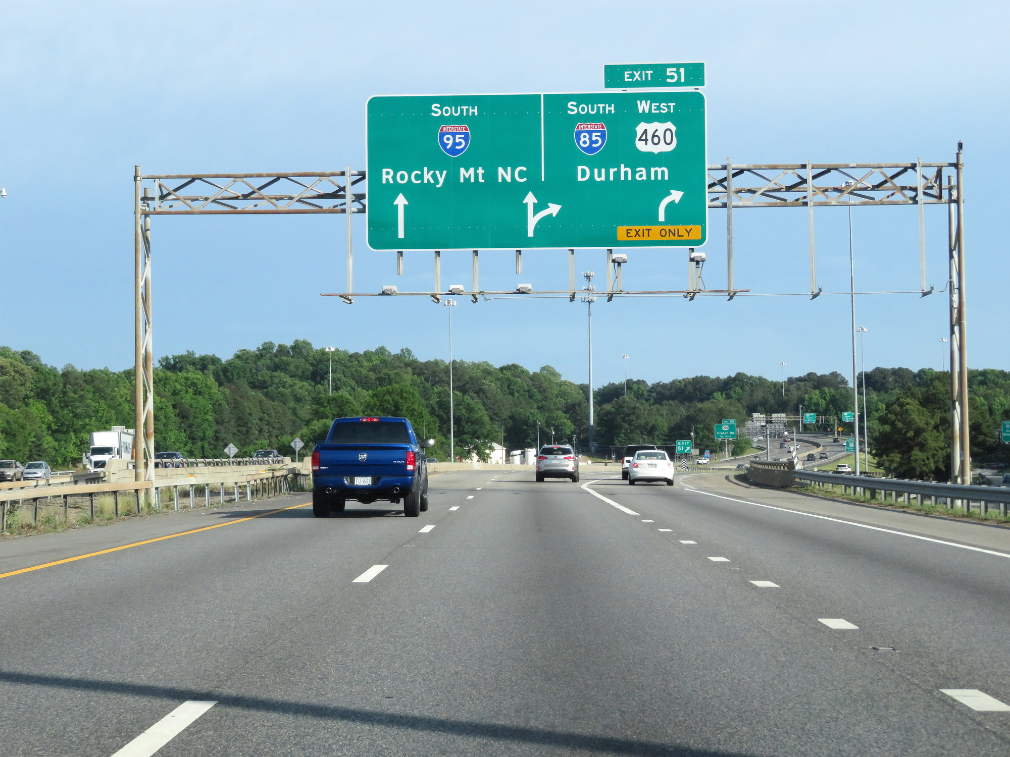 Interstate 95 South at Exit 51: Interstate 85 South / US 460 West - Durham (Photo taken 5/19/17). |